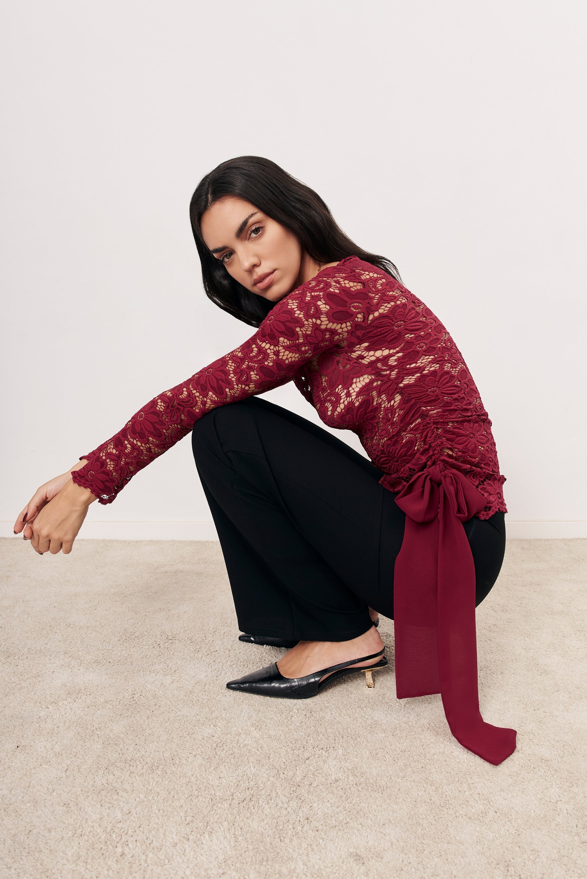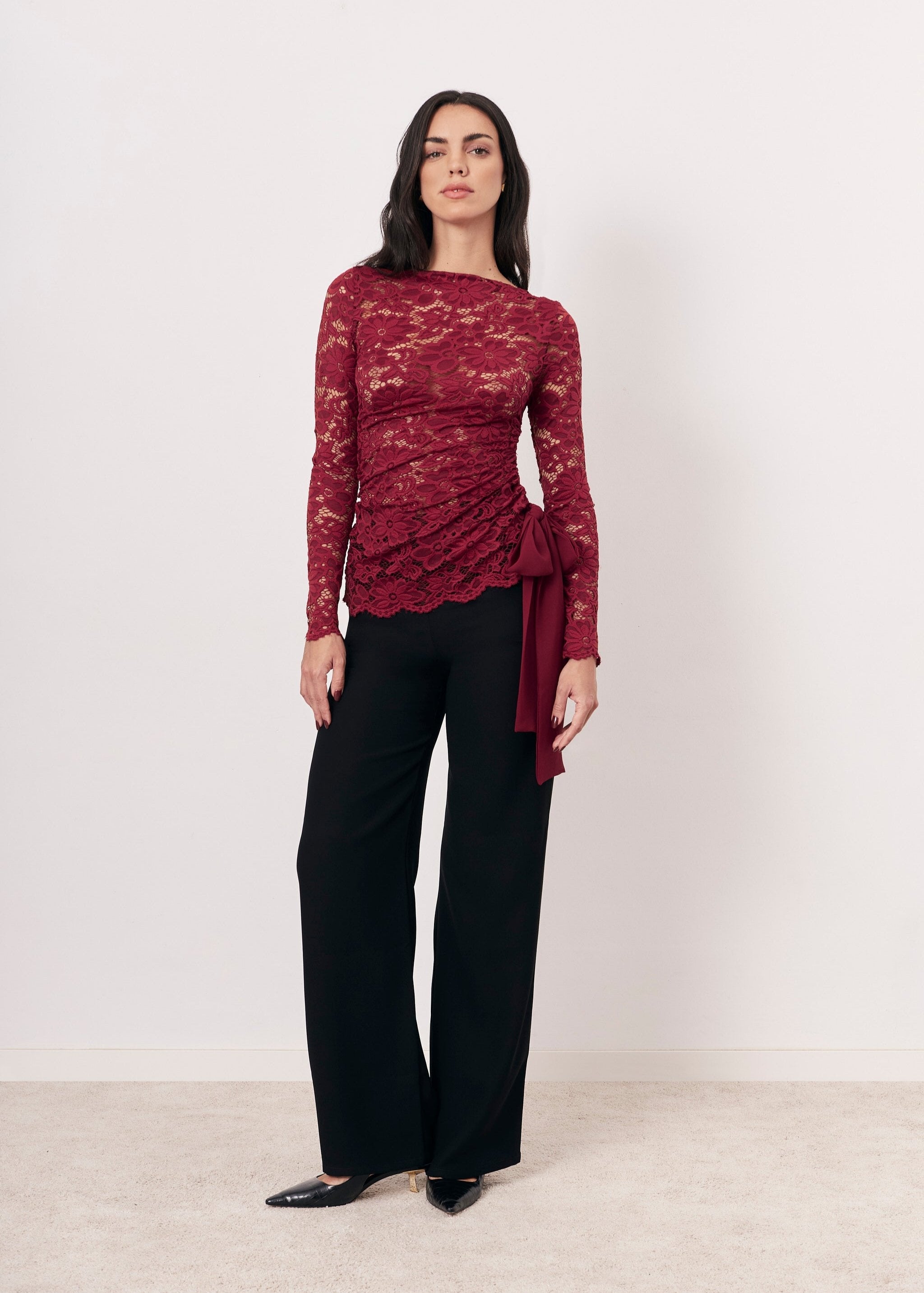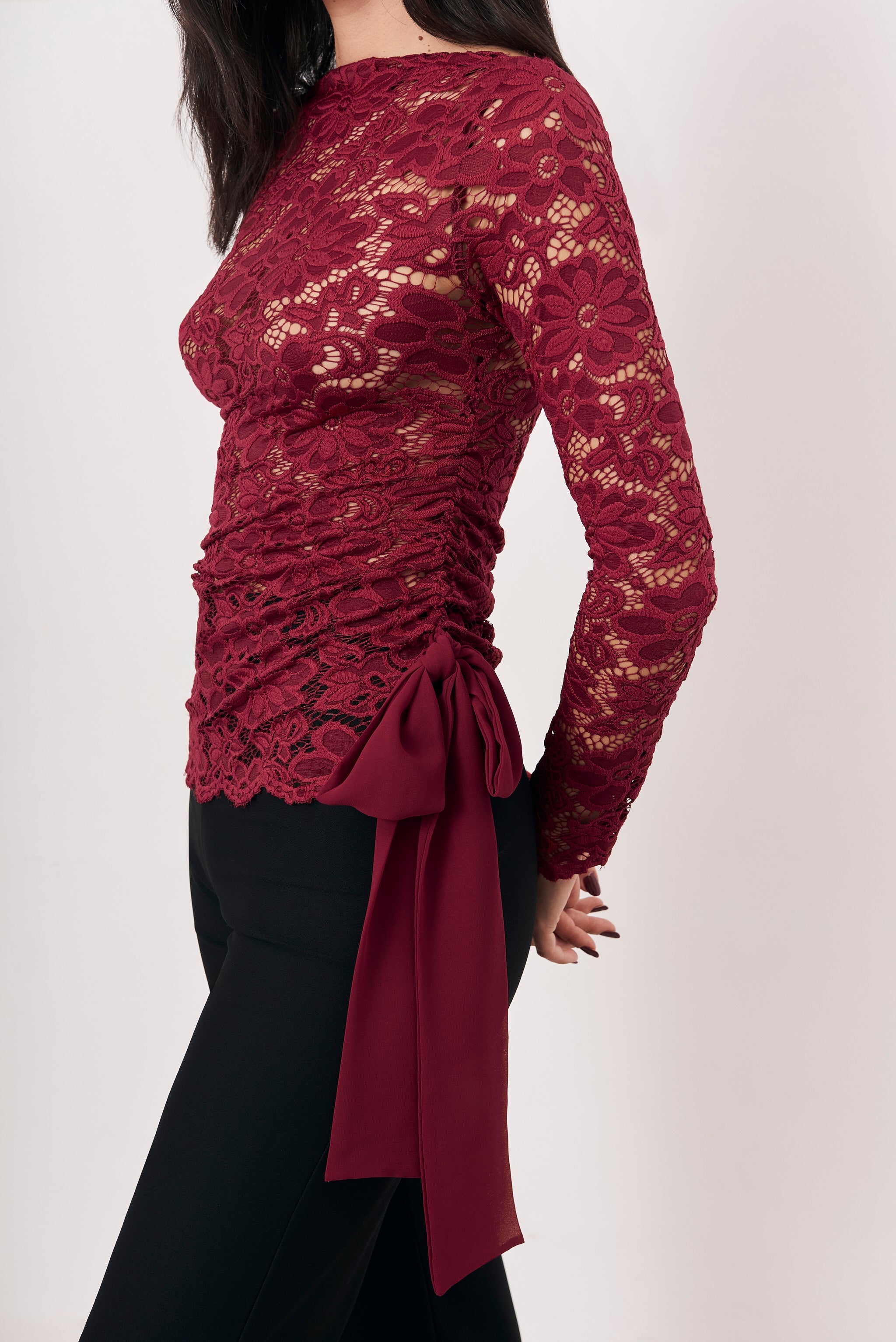 Blusa encaje rojo oscuro con transparencias y escote barco. Manga larga, gran lazada lateral y bajo asimétrico. Tejido elástico para mayor libertad de movimiento. Cuerpo sin forro.