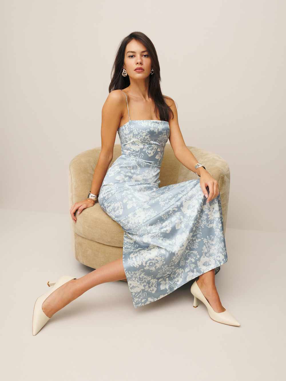 Soyeux. Découvrez la robe en soie Frankie de Reformation, une robe à la coupe ajustée avec un col droit, des bretelles fines et une fente au milieu du dos.