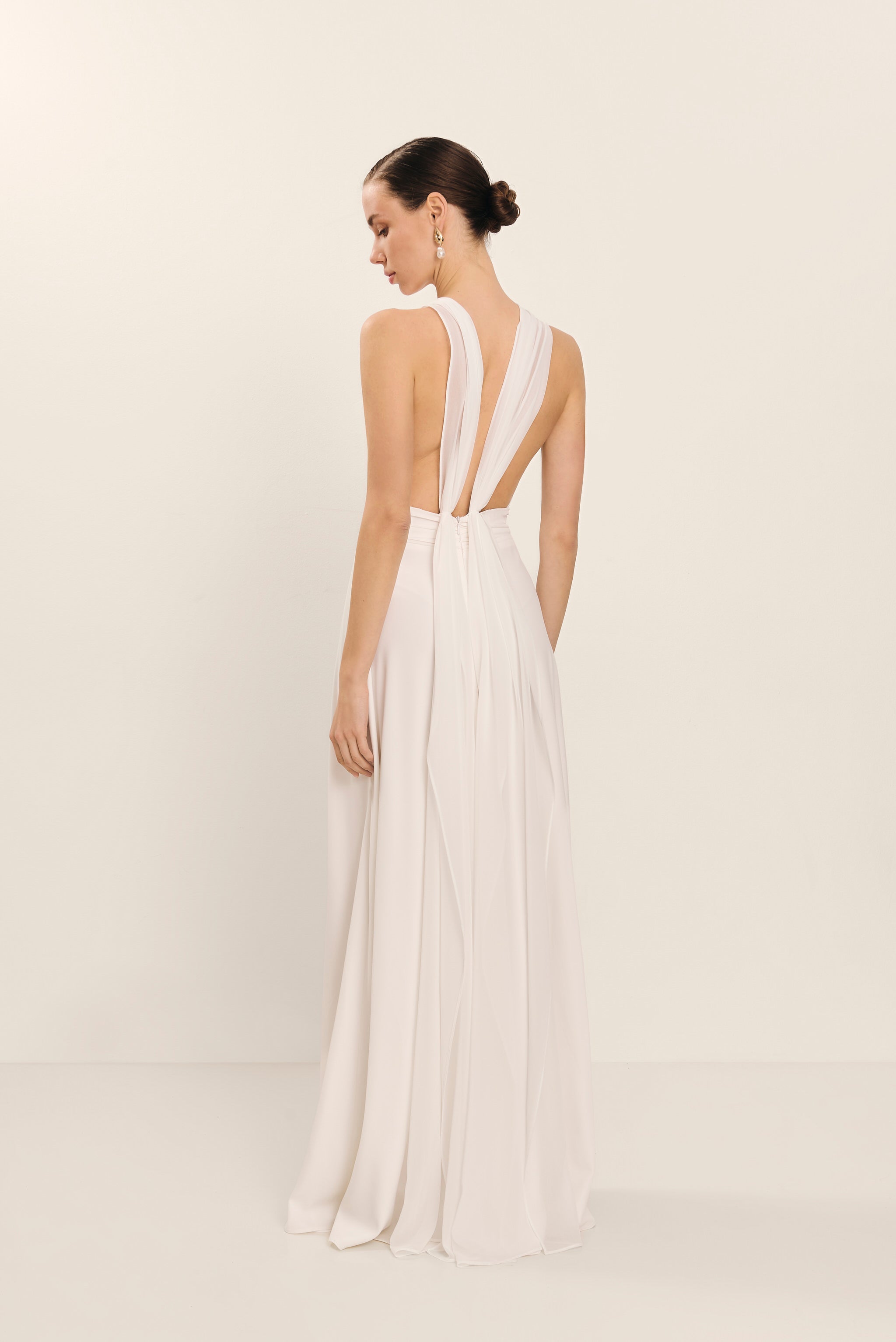 El vestido Adda bridal es la definición de sofisticación y delicadeza a la vez. Su favorecedor escote en V y la cintura ajustada estilizan la silueta, mientras que la espalda descubierta, adornada con cintas de gasa en cascada, aporta un aire etéreo y romántico. La falda larga, ligera y fluida, es la ideal para una novia que busca una elegancia natural. Totalmente forrado con crepé a tono.