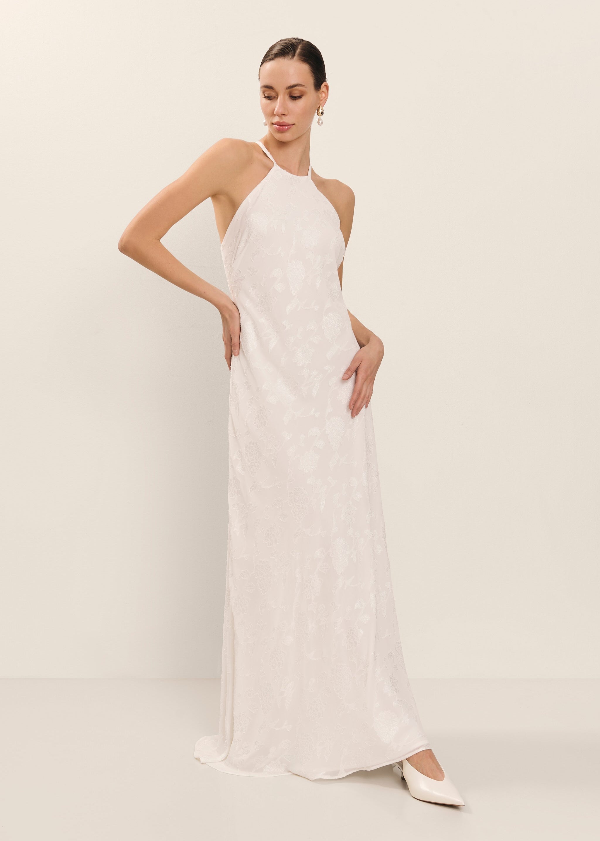 El vestido Darya Bridal combina a la perfección elegancia y carácter. Confeccionado en un exquisito jacquard floral, su diseño aporta un aire moderno y refinado. Destaca por su sofisticado escote halter y una espalda descubierta con ajuste personalizado, que realzan la silueta con sutileza. Su tejido estructurado pero ligero se mueve con gracia, convirtiéndolo en la elección ideal para una novia que busca distinción y romanticismo en cada detalle. Totalmente forrado con tejido crepé a tono.
