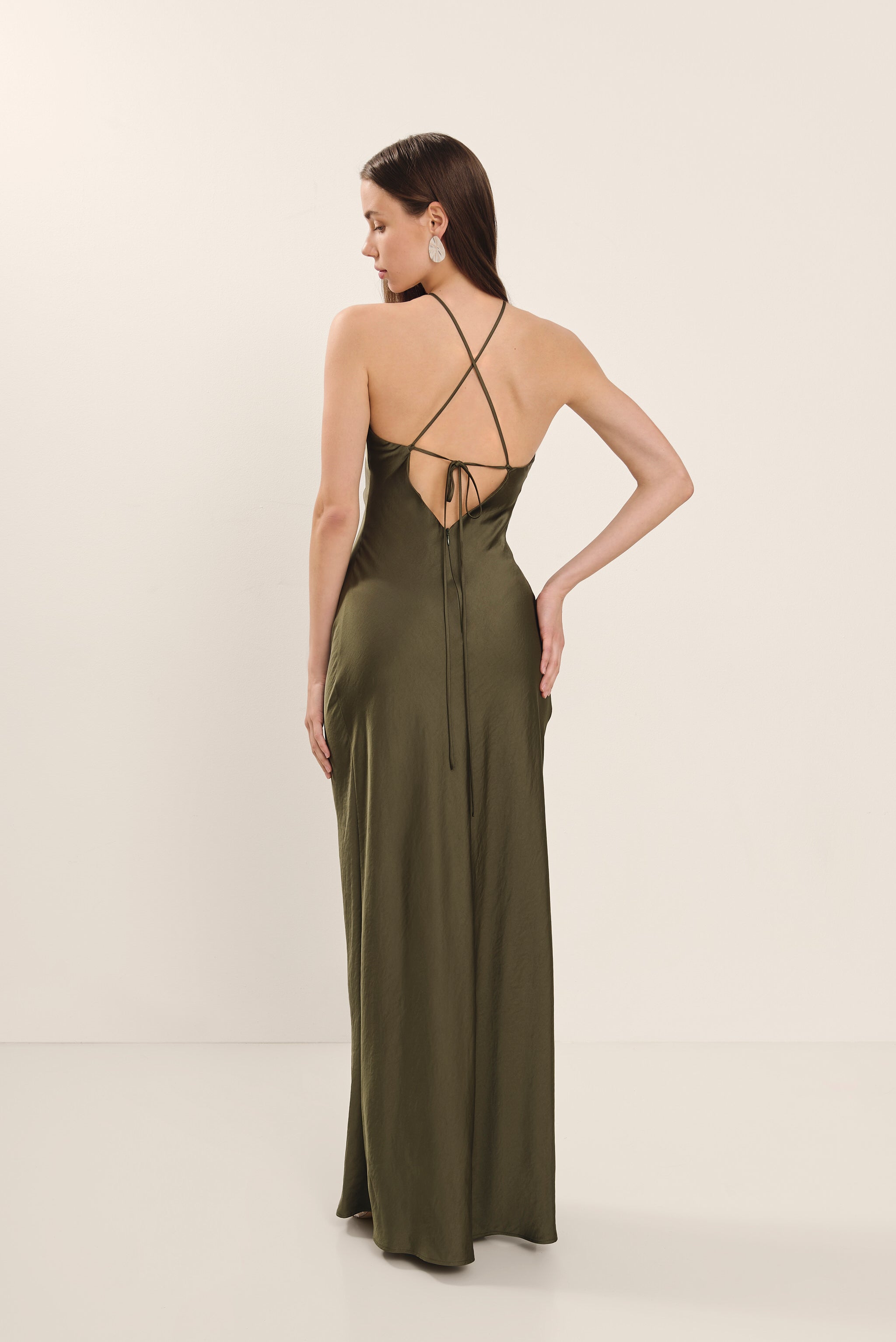 Vestido en raso color verde caqui, ideal para una ocasión especial. Su diseño halter y corte al biés realza tu figura, mientras que la espalda descubierta regulable le añade un toque más atrevido. Tiene a conjunto el chal a tono para darle un toque distinto al look.