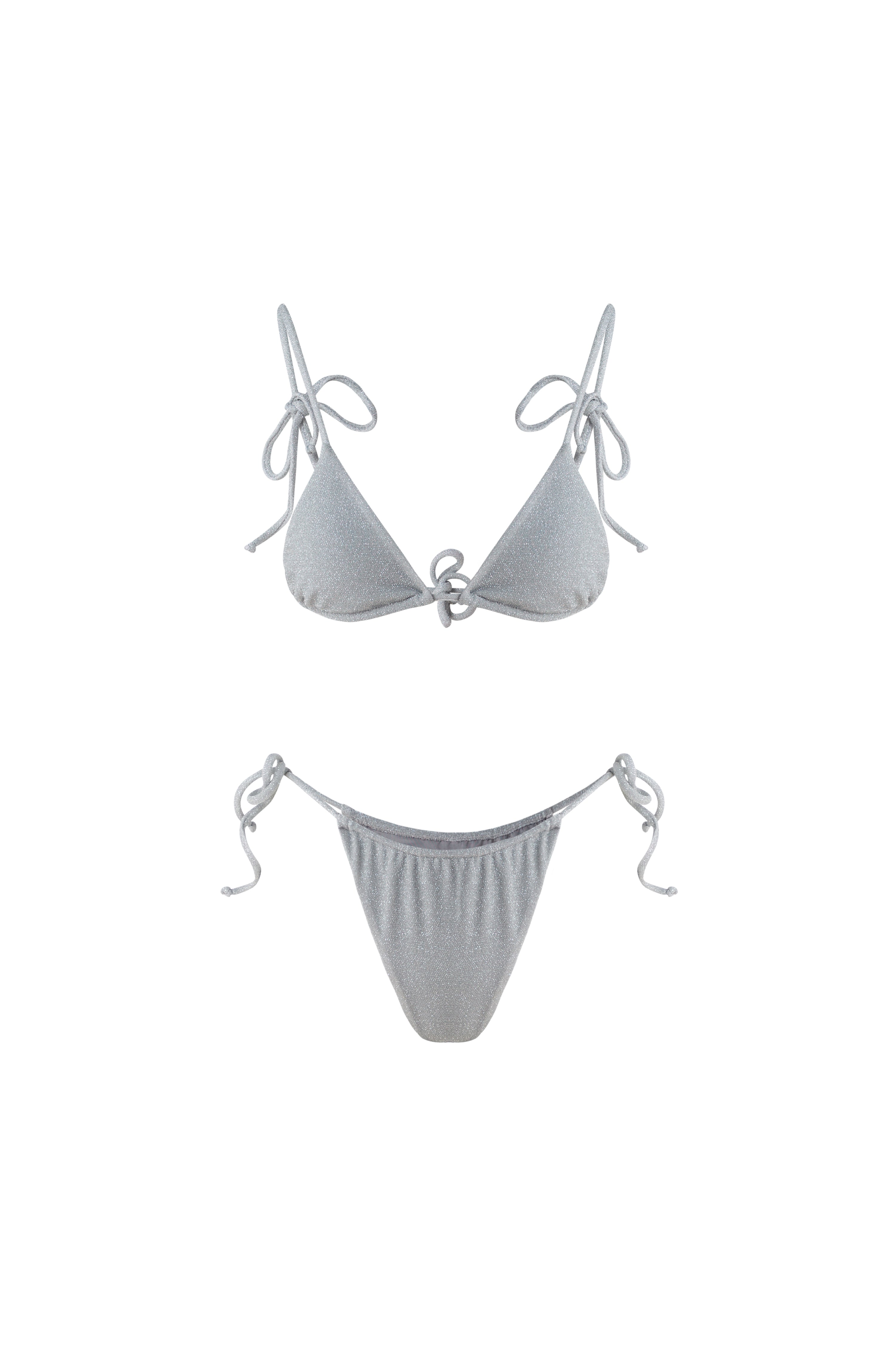 The Claudia Sparkly Triangle Bikini features a top with adjustable self-tie straps, while the bottom has a cheeky shape that can be worn high-rise or mid-rise. Both pieces are cut from sparkly lurex swim fabric and are fully lined for added comfort.