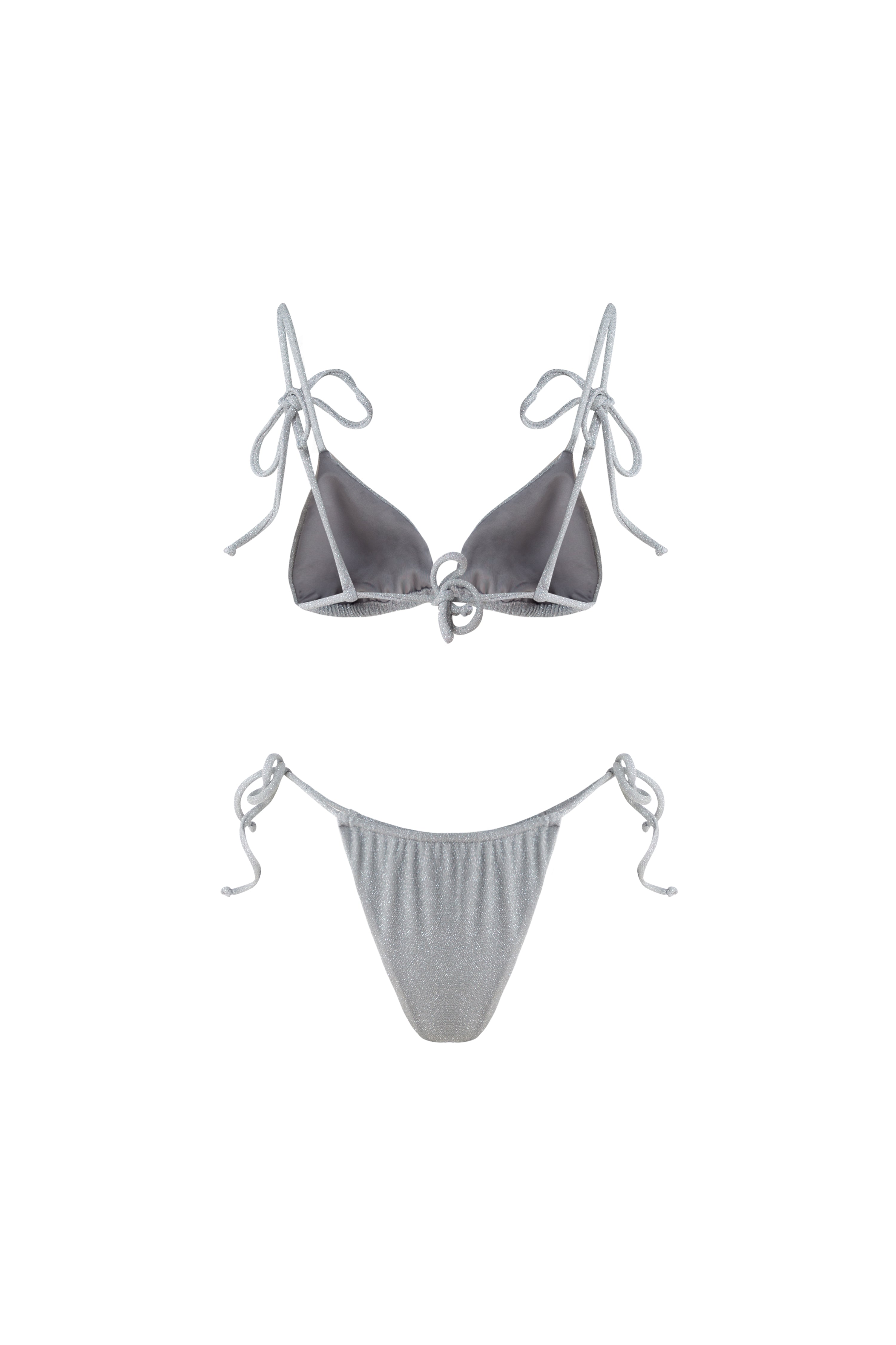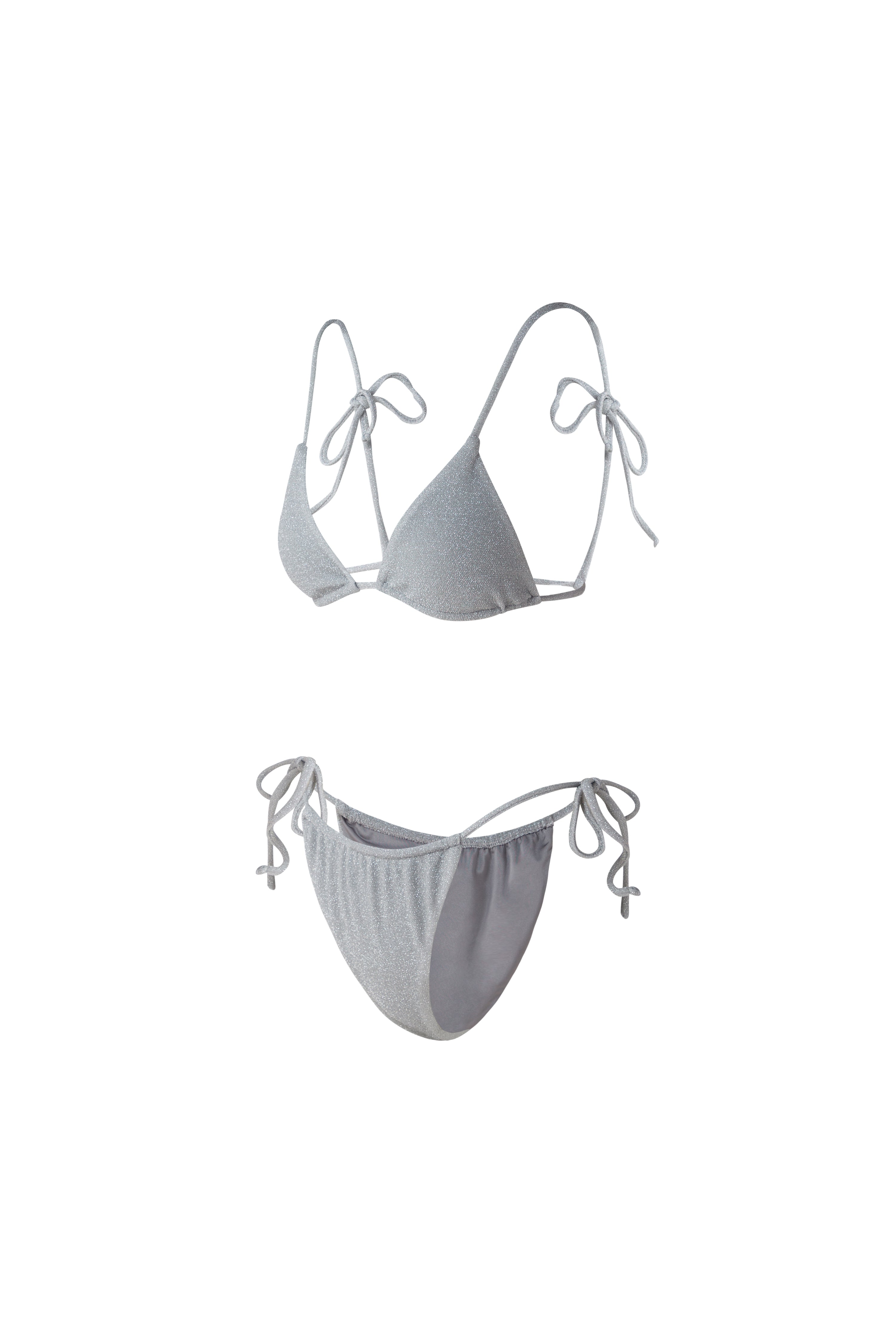 Material 65% nylon, 30% lurex, 5% elastane Care instructions Place in laundry bag when being washed Color Silver Gray Style Triangle Bikini Top Size Options XS, S, M, L, XL Bottom Size Options XS, S, M, L, XL