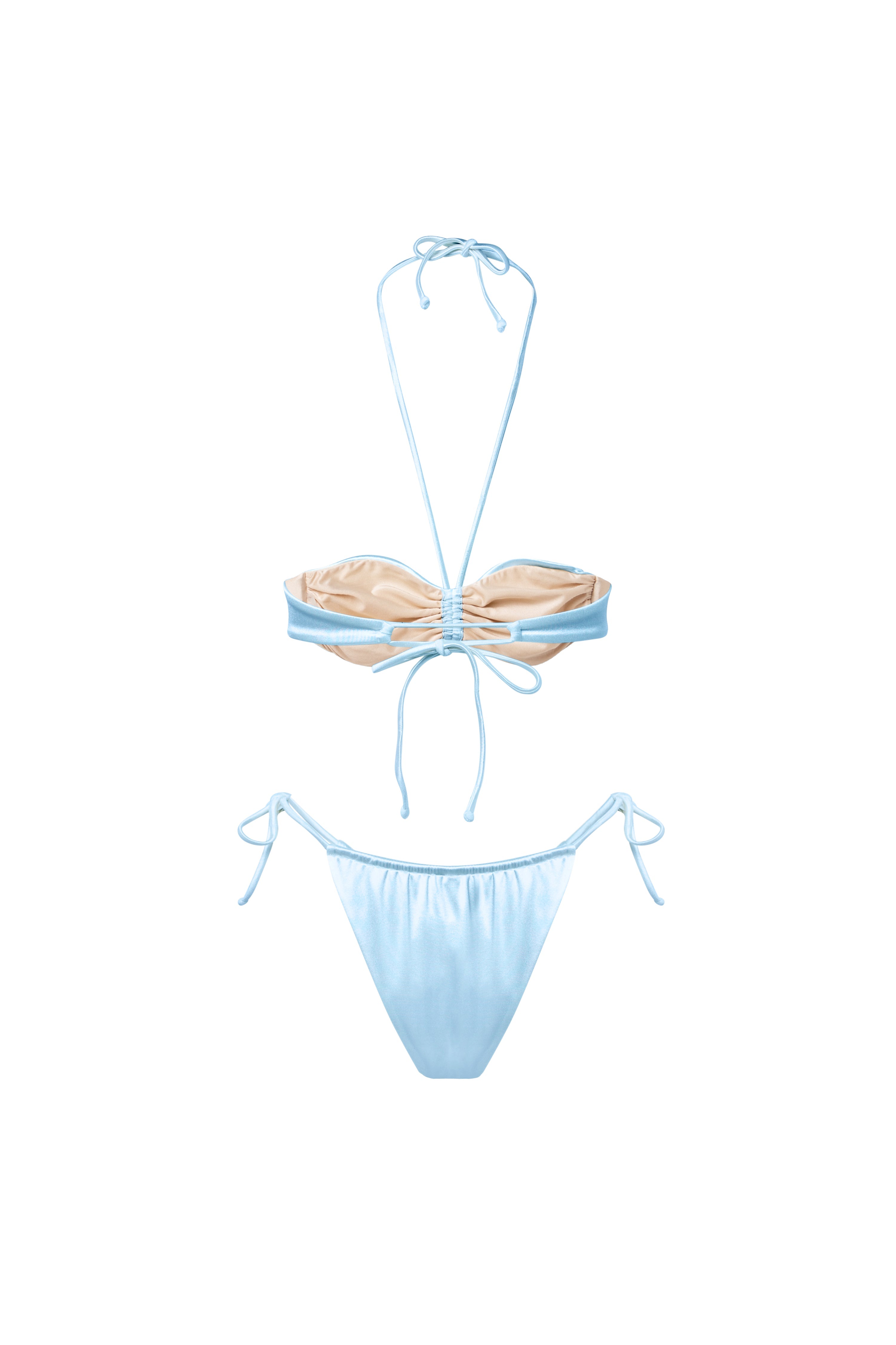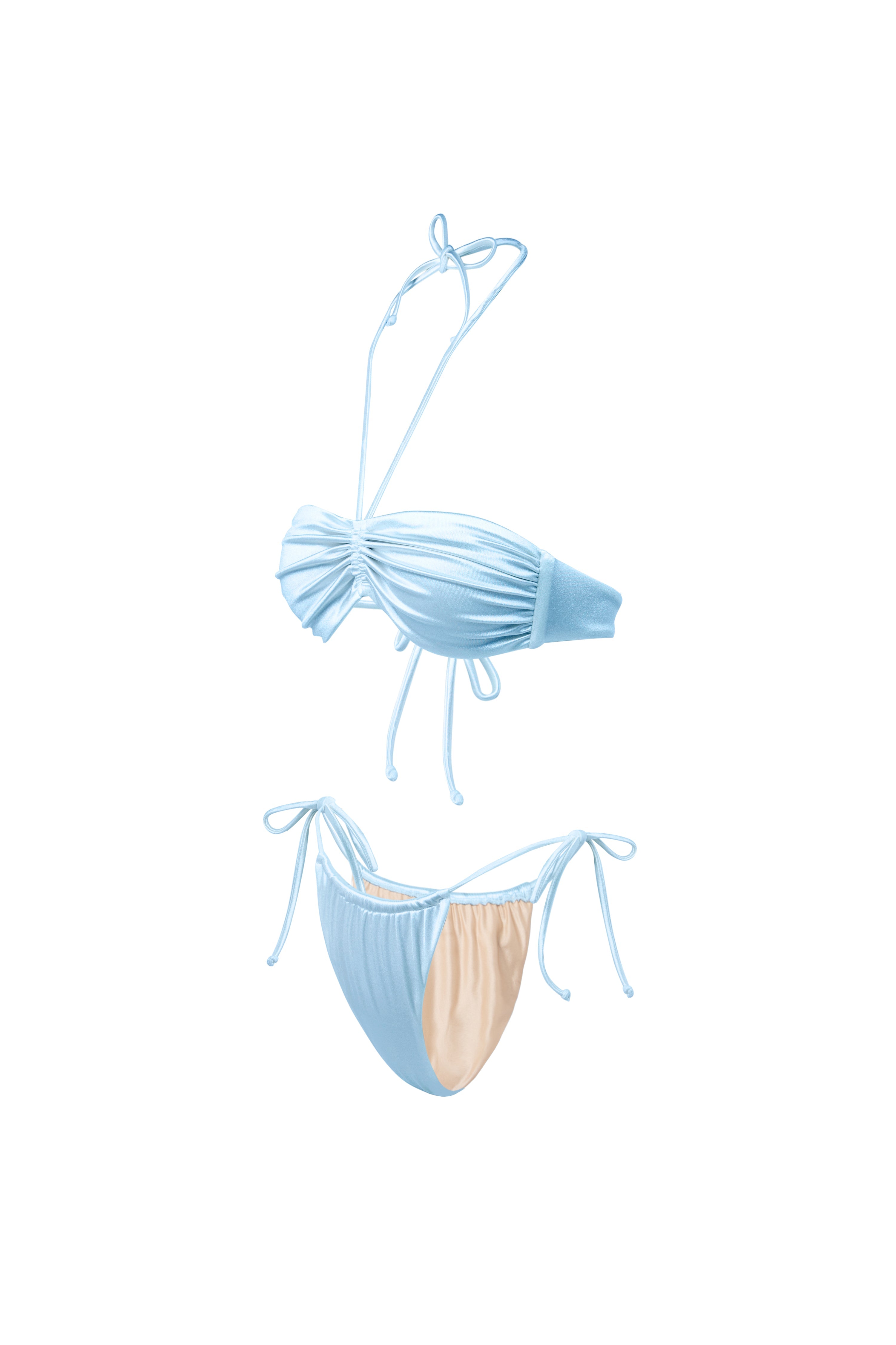 The Monica Glossy Bikini features a bandeau top with self-tie straps. The bikini bottom has a cheeky shape and an adjustable fit, allowing it to be worn high-rise or mid-rise. Both pieces are made from glossy swim fabric and are fully lined for comfort and style.