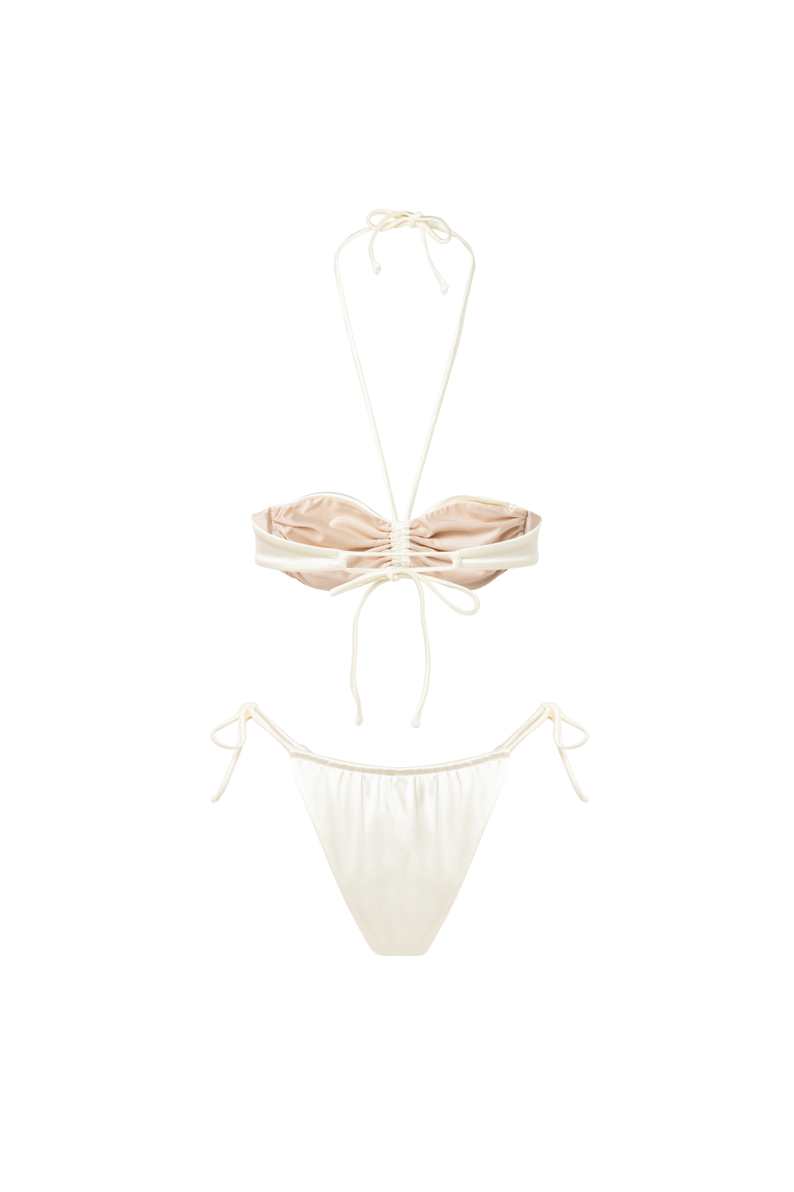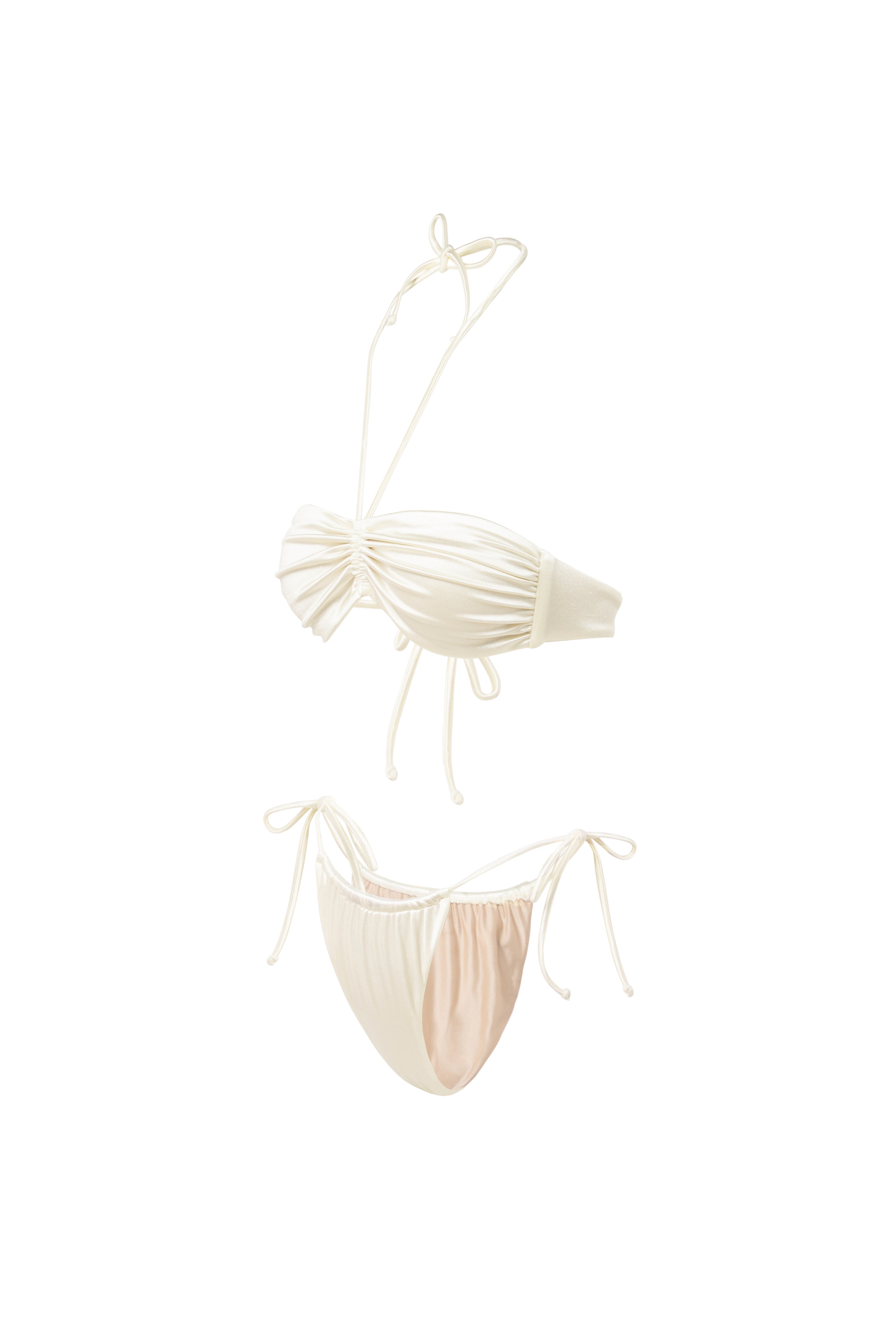 Material 90% nylon, 10% elastane Color White Pearl Bikini Top Style Bandeau with self-tie straps Bikini Bottom Style Cheeky shape with adjustable fit Lining Fully lined