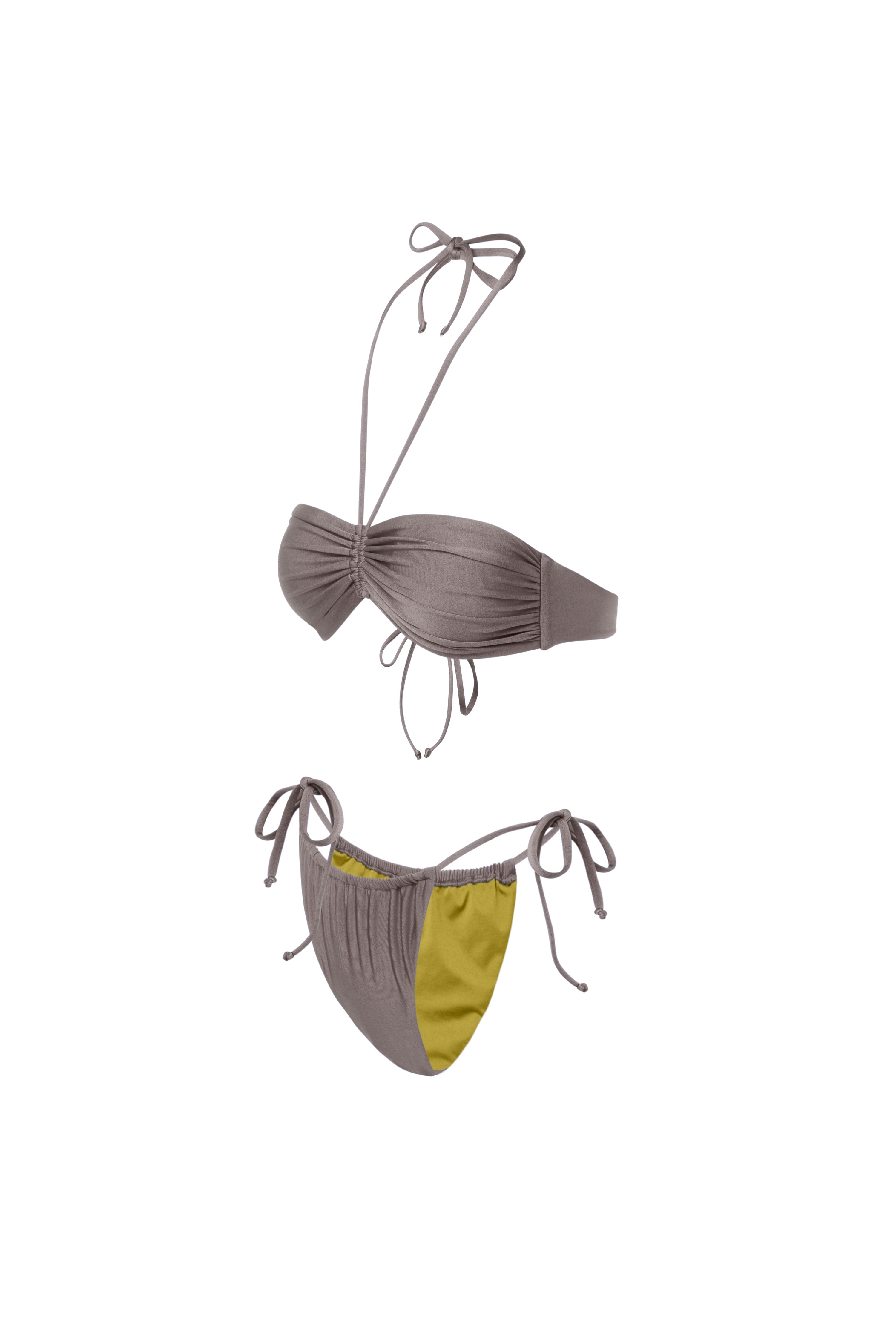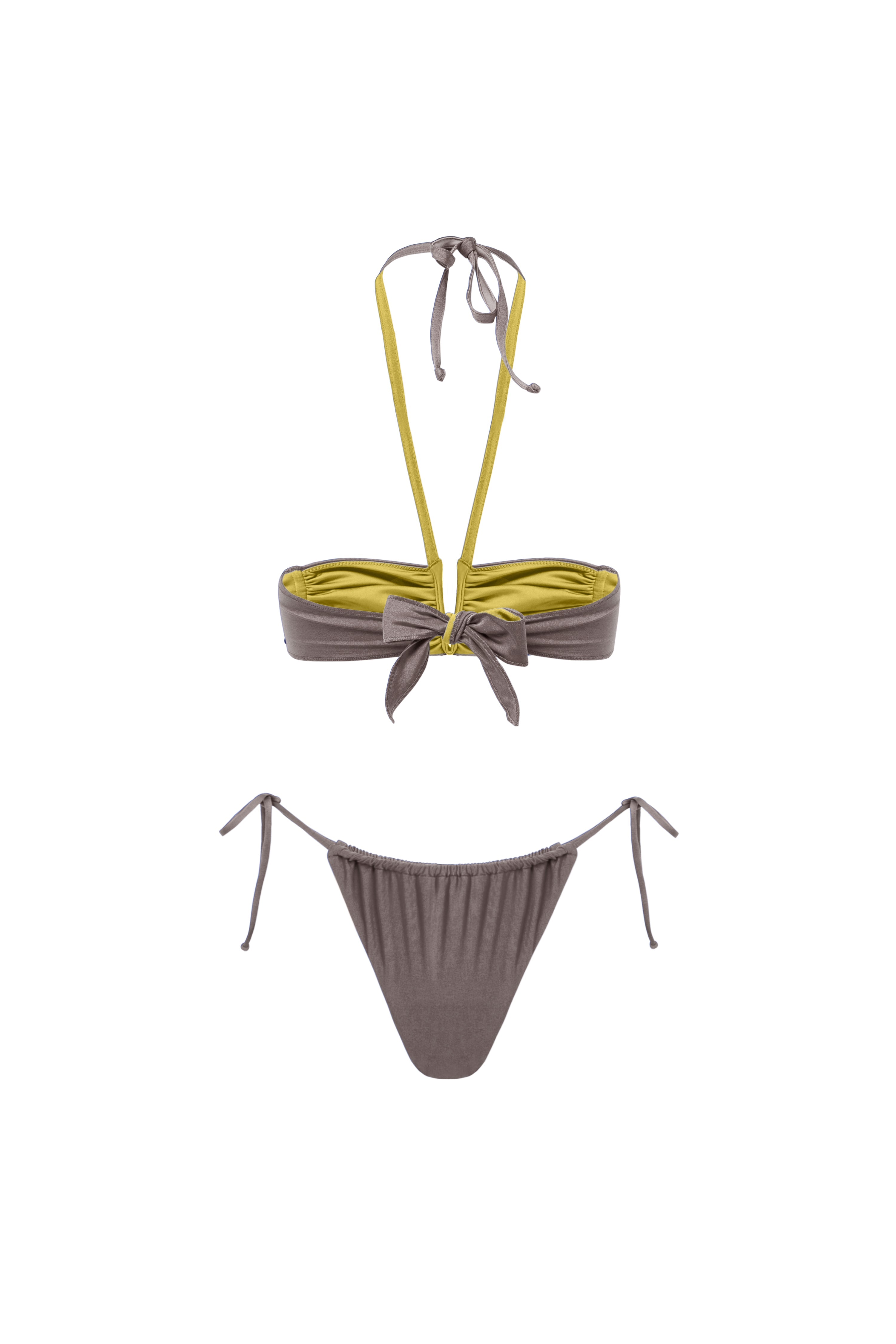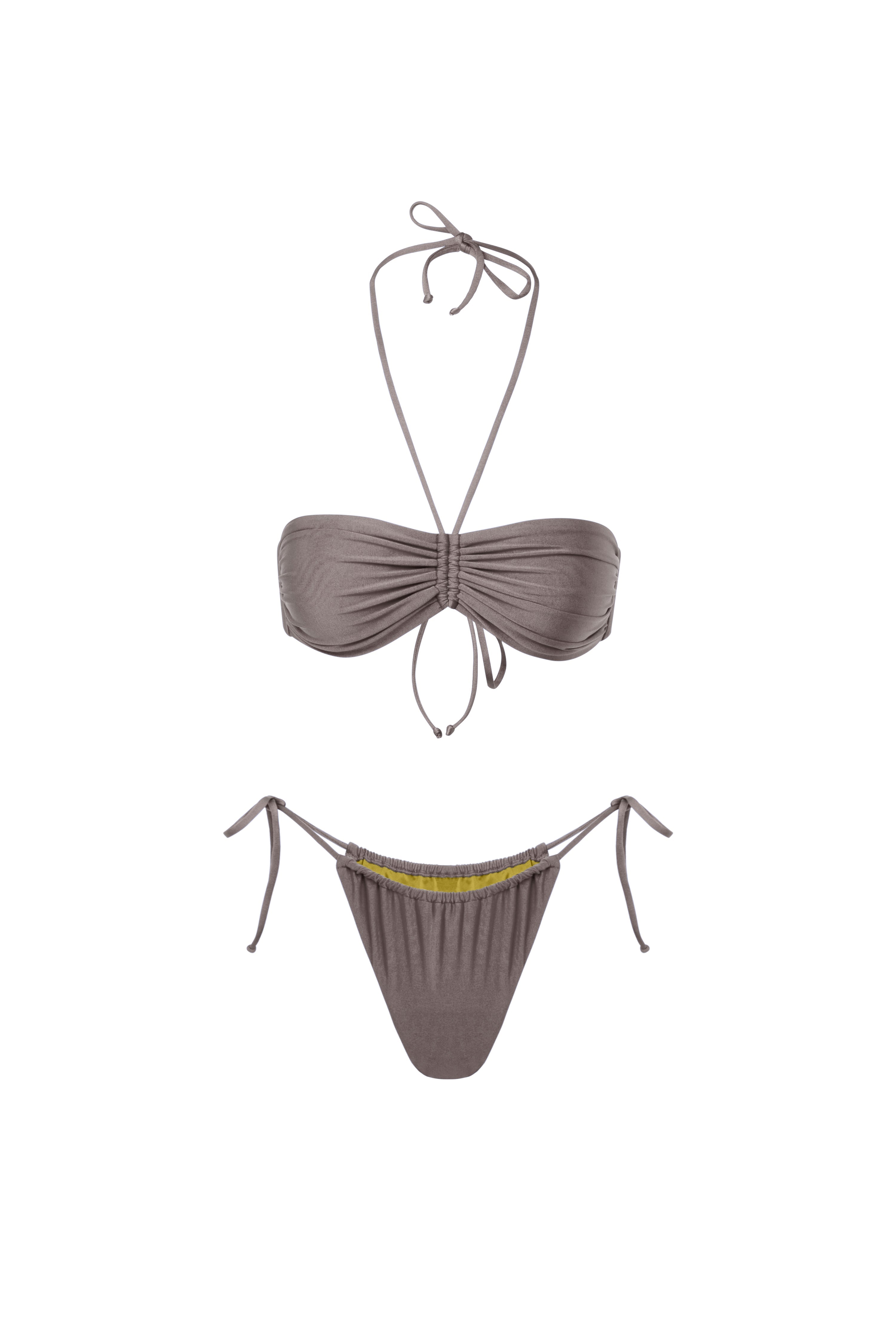 The Monica Shiny Bikini features a bandeau top with self-tie straps. The bikini bottom has a cheeky shape and an adjustable fit, allowing it to be worn high-rise or mid-rise. Both pieces are made from shiny swim fabric and are fully lined for comfort and style.