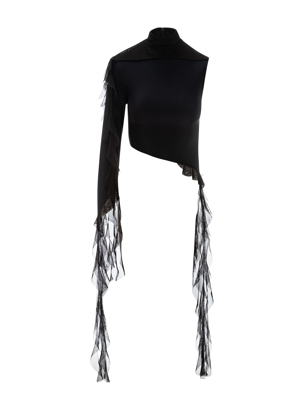 The Giada Top showcases a stylish combination of a turtleneck, one-shoulder design, and an asymmetric cut. Tonal ruffles delicately descend from the shoulder straps to the straight hem, while the cuffs boast a meticulously hand-finished hemline and a subtly ruched design.