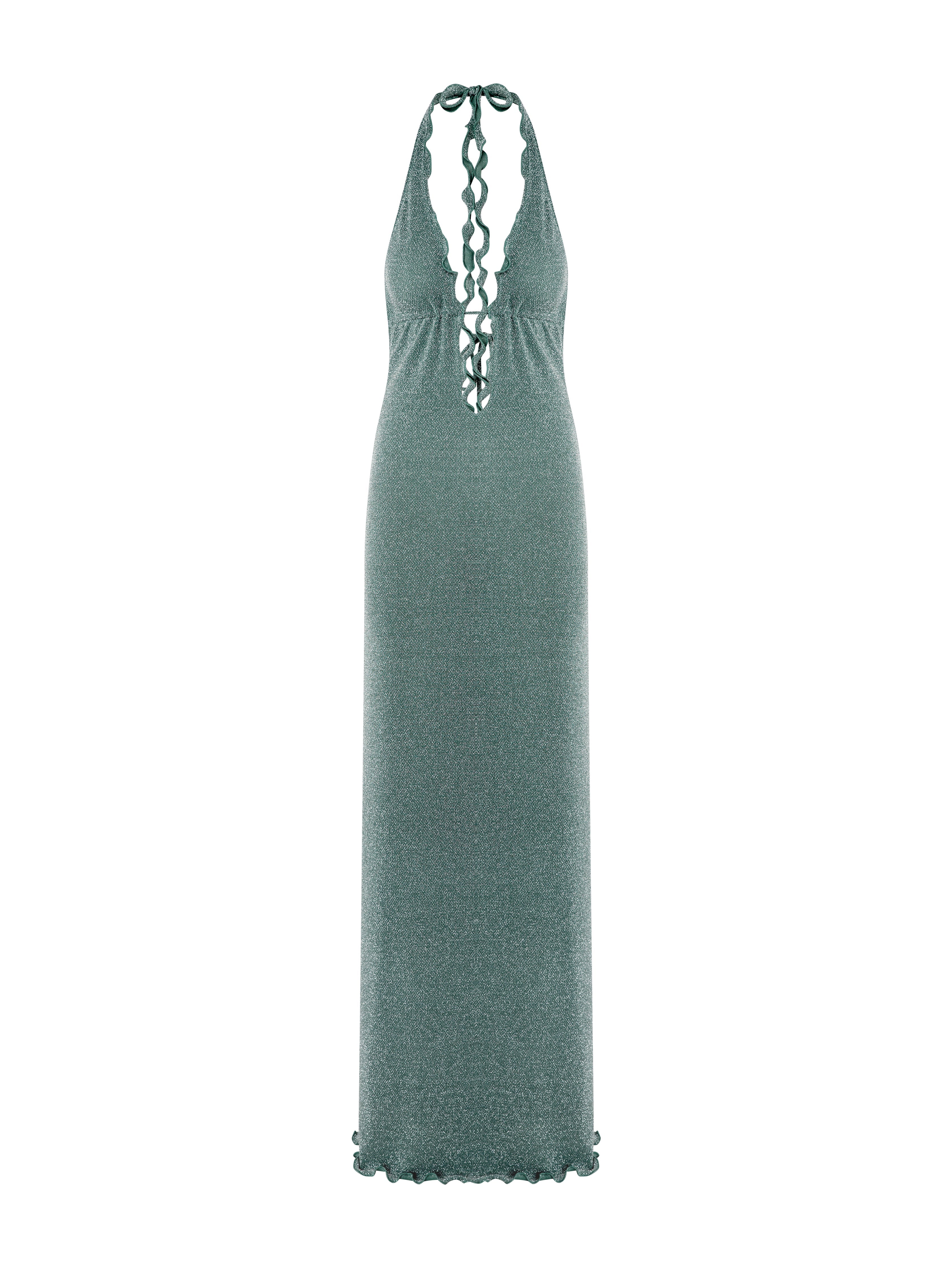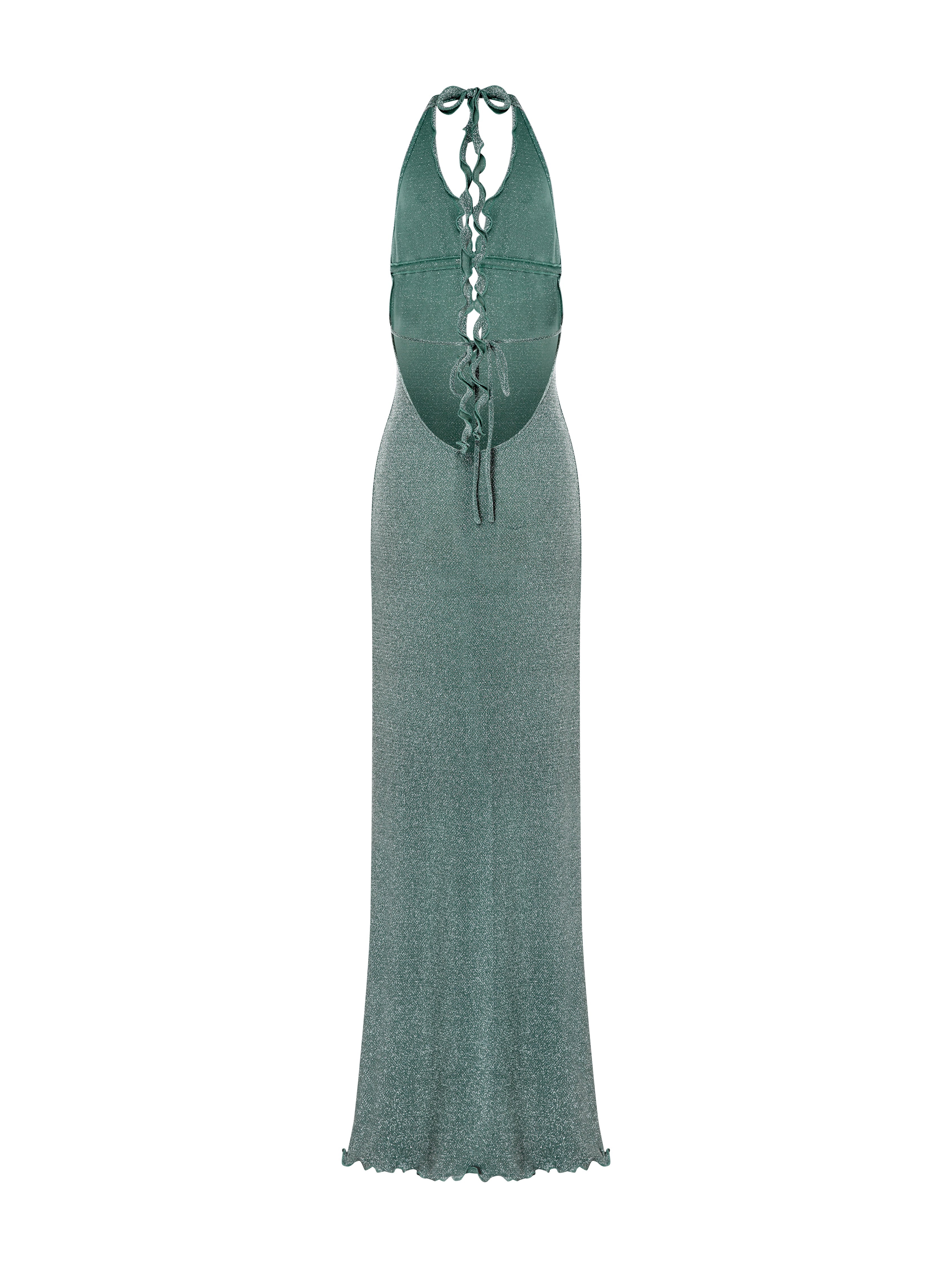 The Lyra Maxi Dress showcases a chic halter neck with a tie closure, complemented by a daring low neckline and an alluring open back. Designed with high-quality sparkly lurex fabric.
