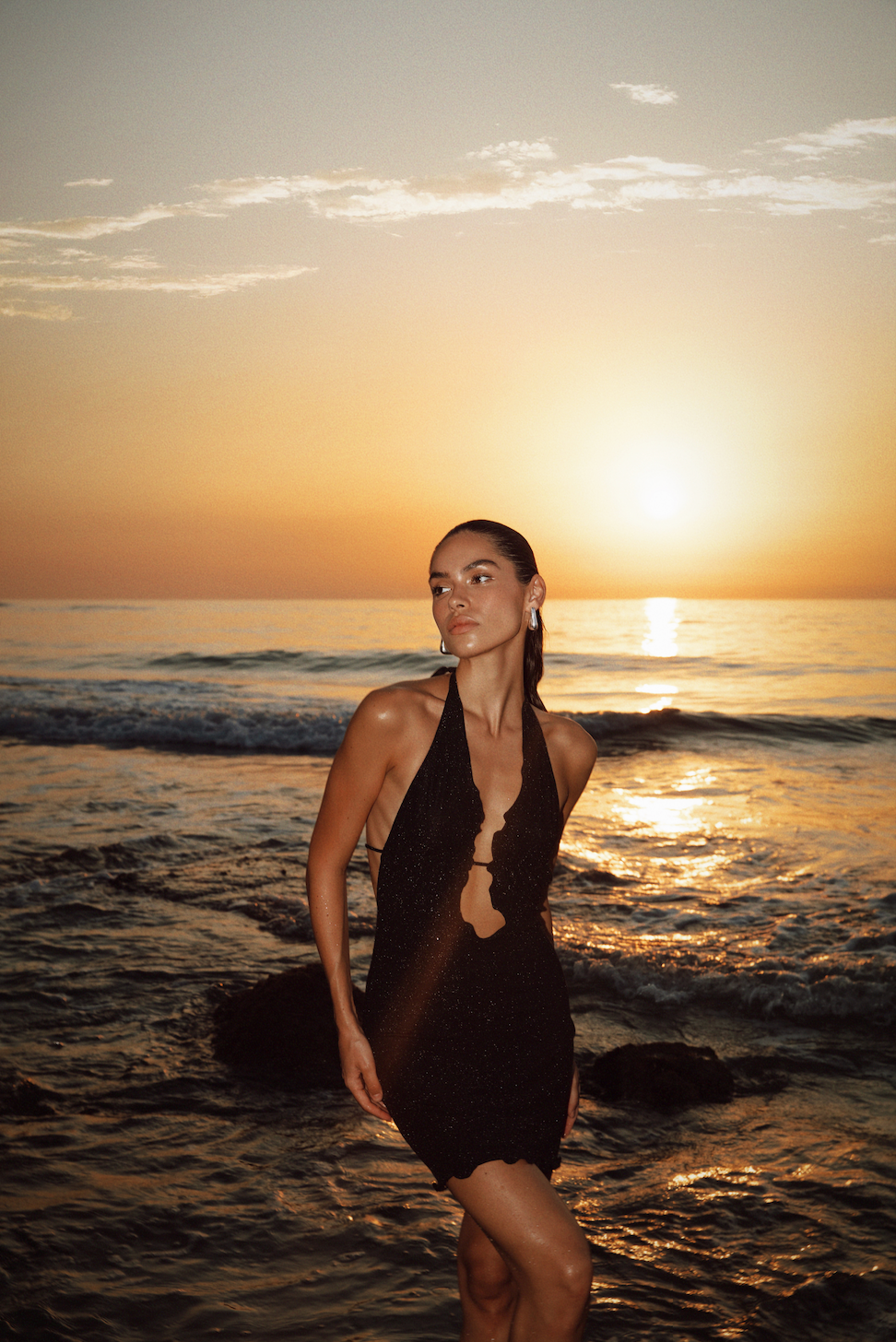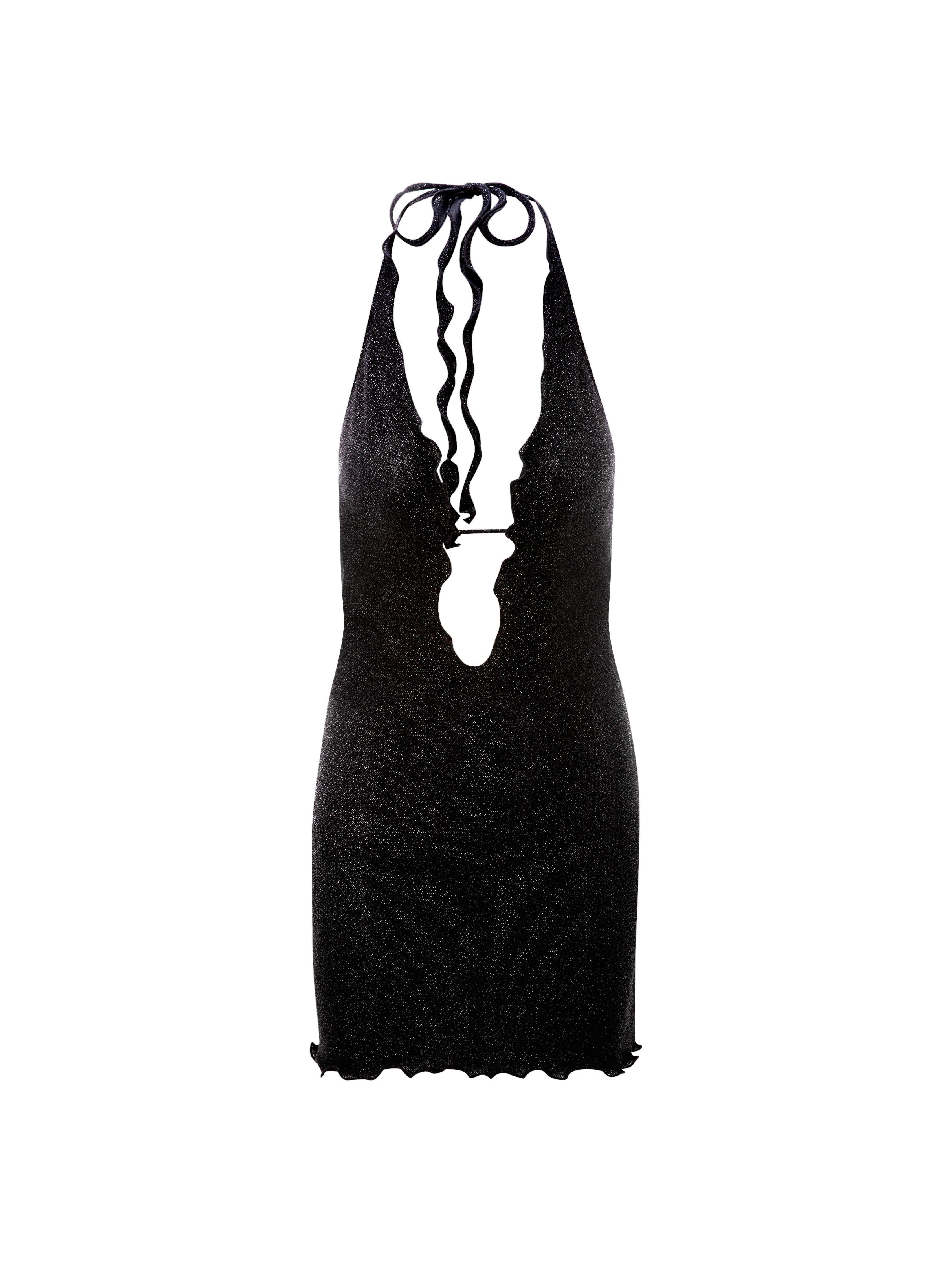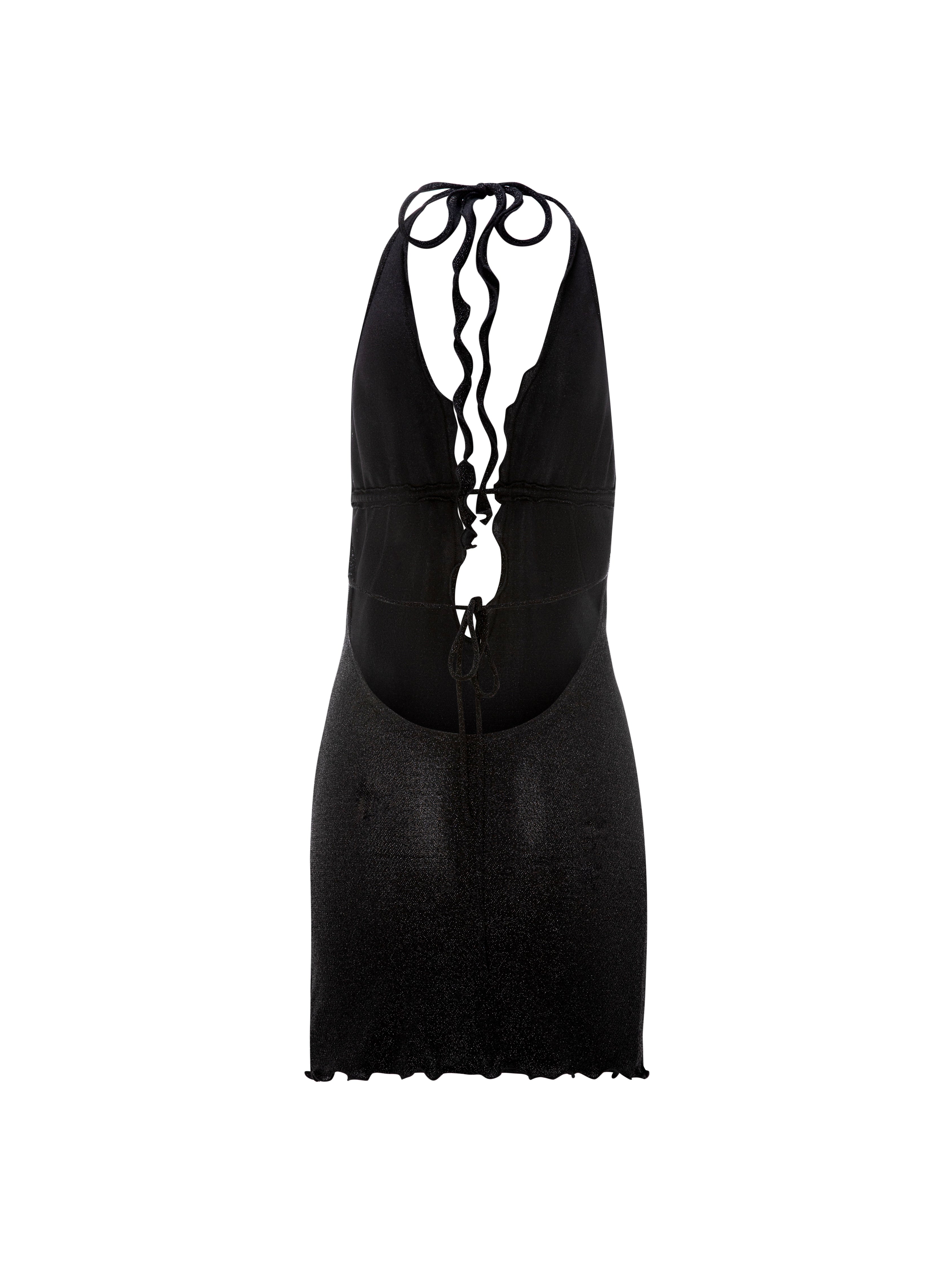 The Lyra Mini Dress showcases a chic halter neck with a tie closure, complemented by a daring low neckline and an alluring open back. Designed with high-quality sparkly lurex fabric.