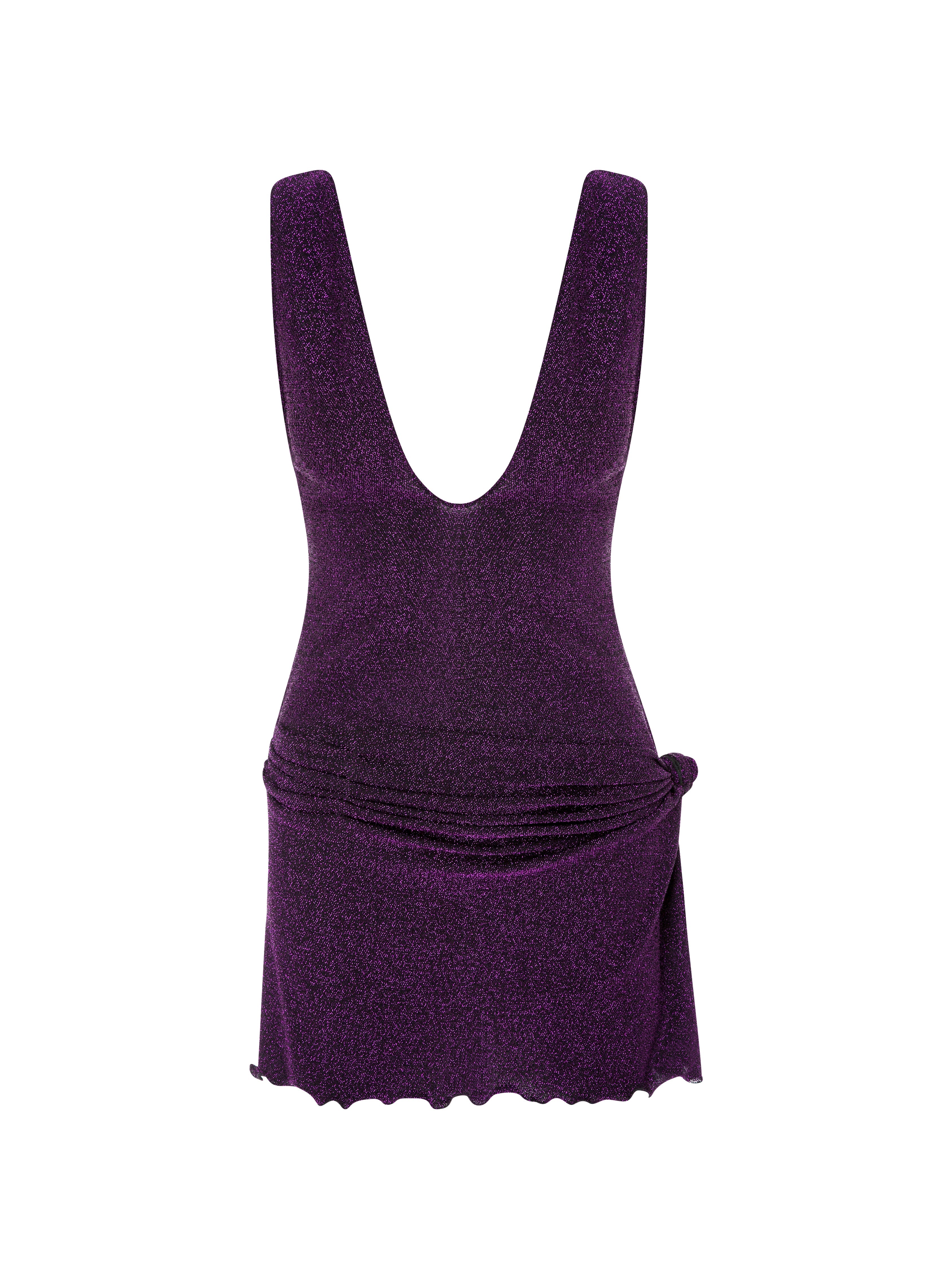 The Mia Mini Dress exudes elegance with its deep V-neckline, sleeveless design, and pleated belt adorned with a side bow. It features a subtle side slit, a hand-finished hemline, and delicately frayed edges for a refined touch. Crafted from premium sparkly lurex fabric.