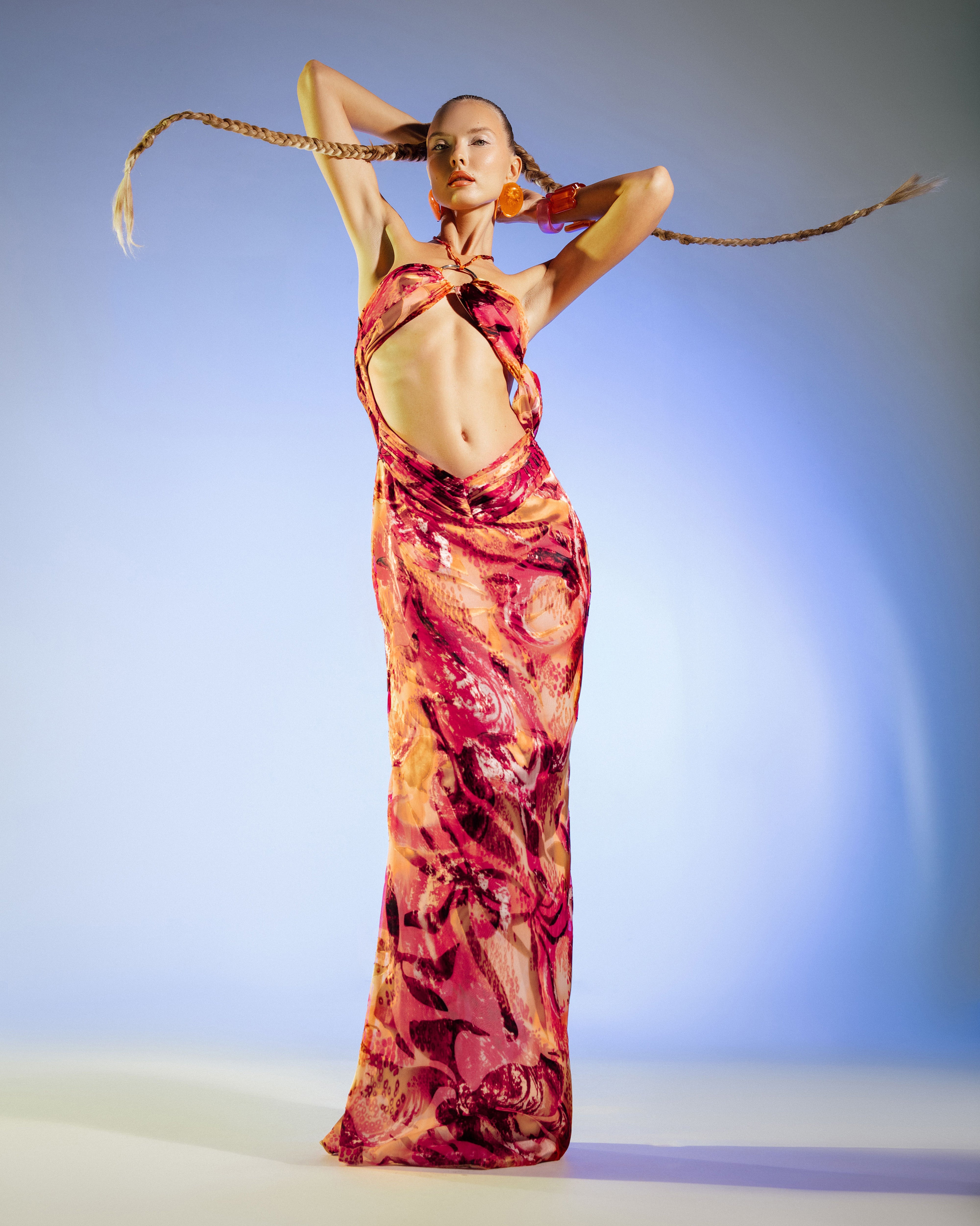 Our Sienna Long Slip Dress boasts a daring front cut-out secured by unique O-wire hardware at the bust. Its sleek design hugs your curves, enhanced by a revealing open back.