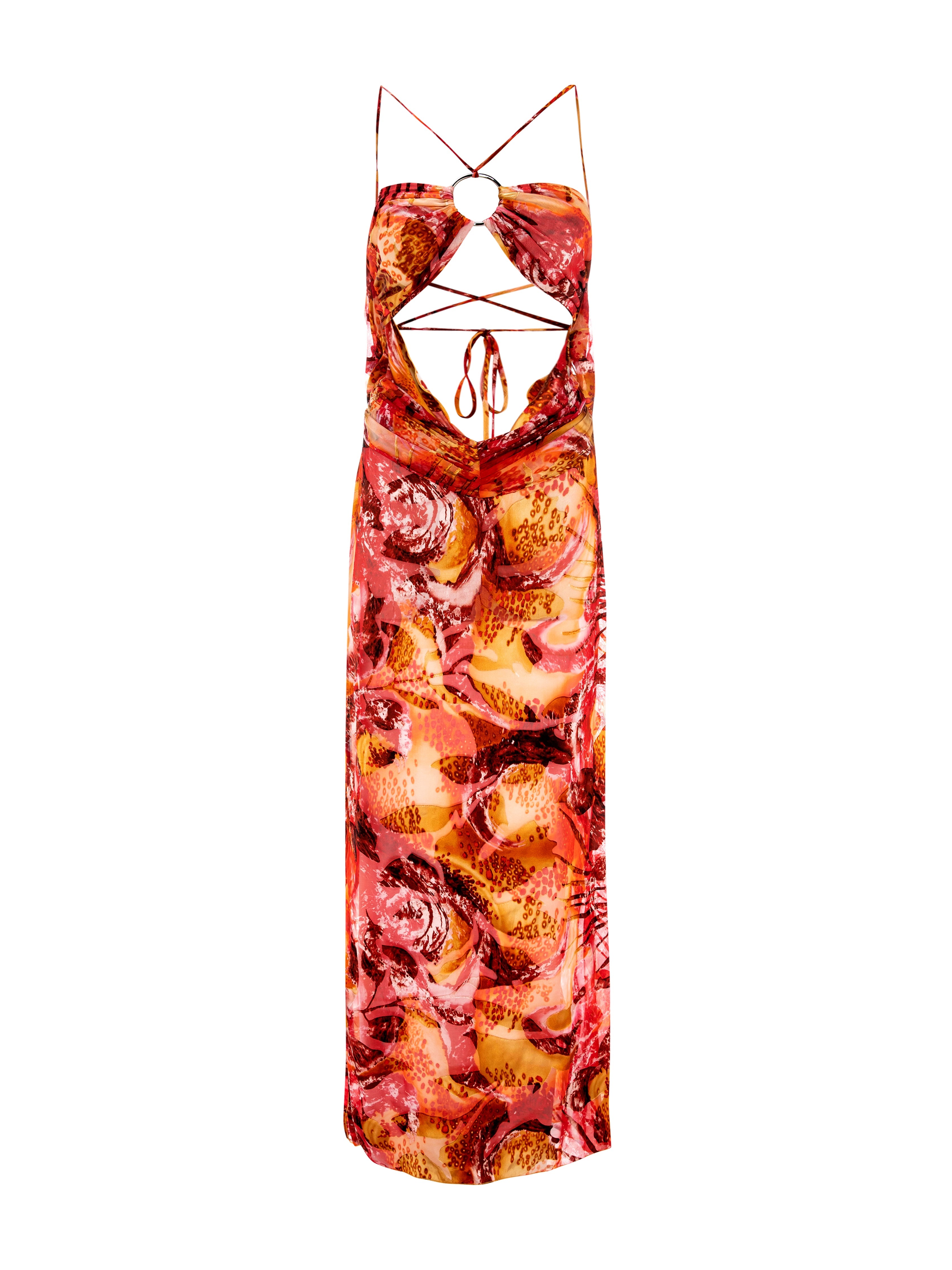 Material 70% Polyester, 30% Silk Design Front cut-out with O-wire hardware Length Maxi length Transparency Semi-sheer Back Design Cowl back Model Height 1.75 cm