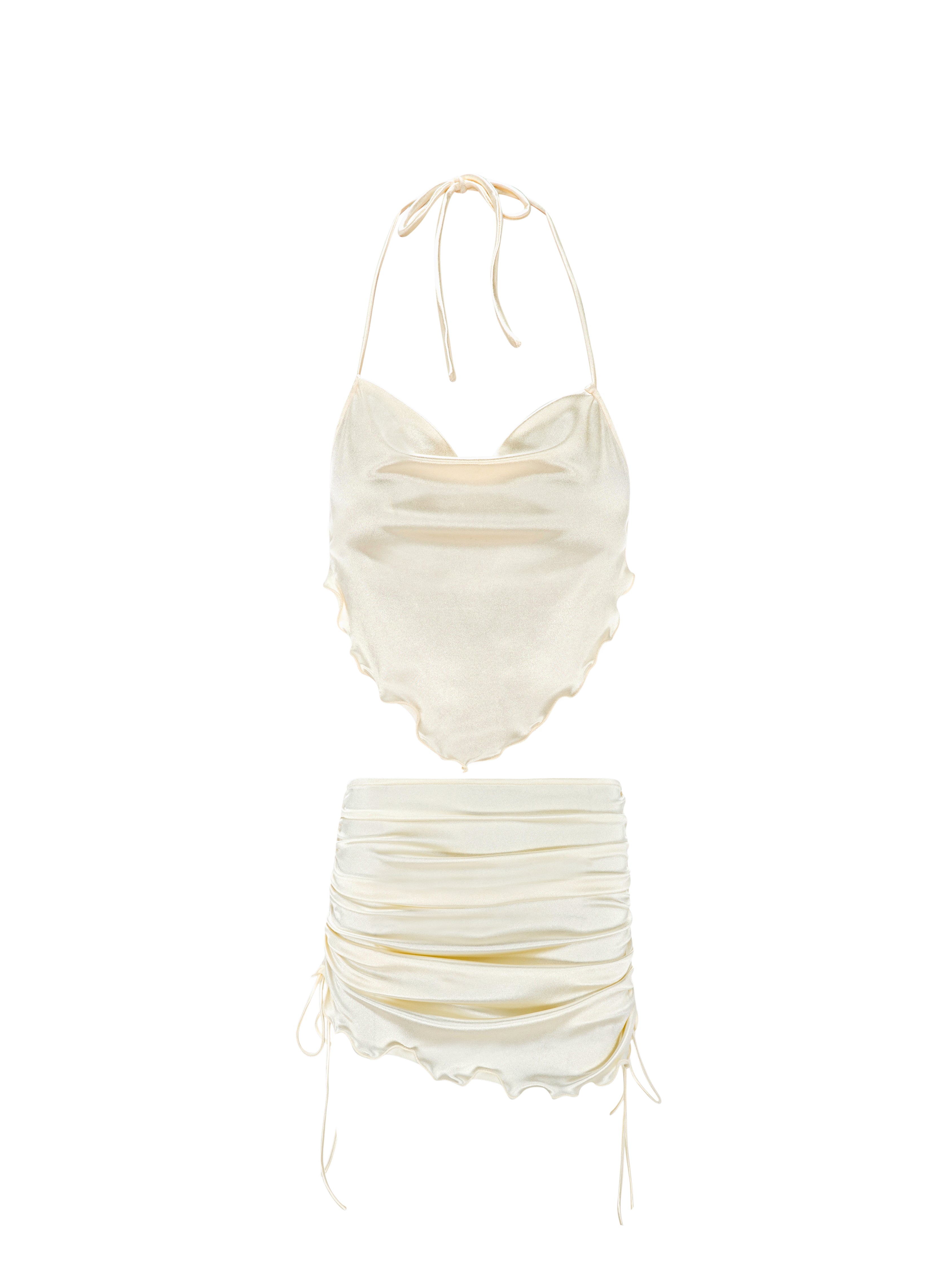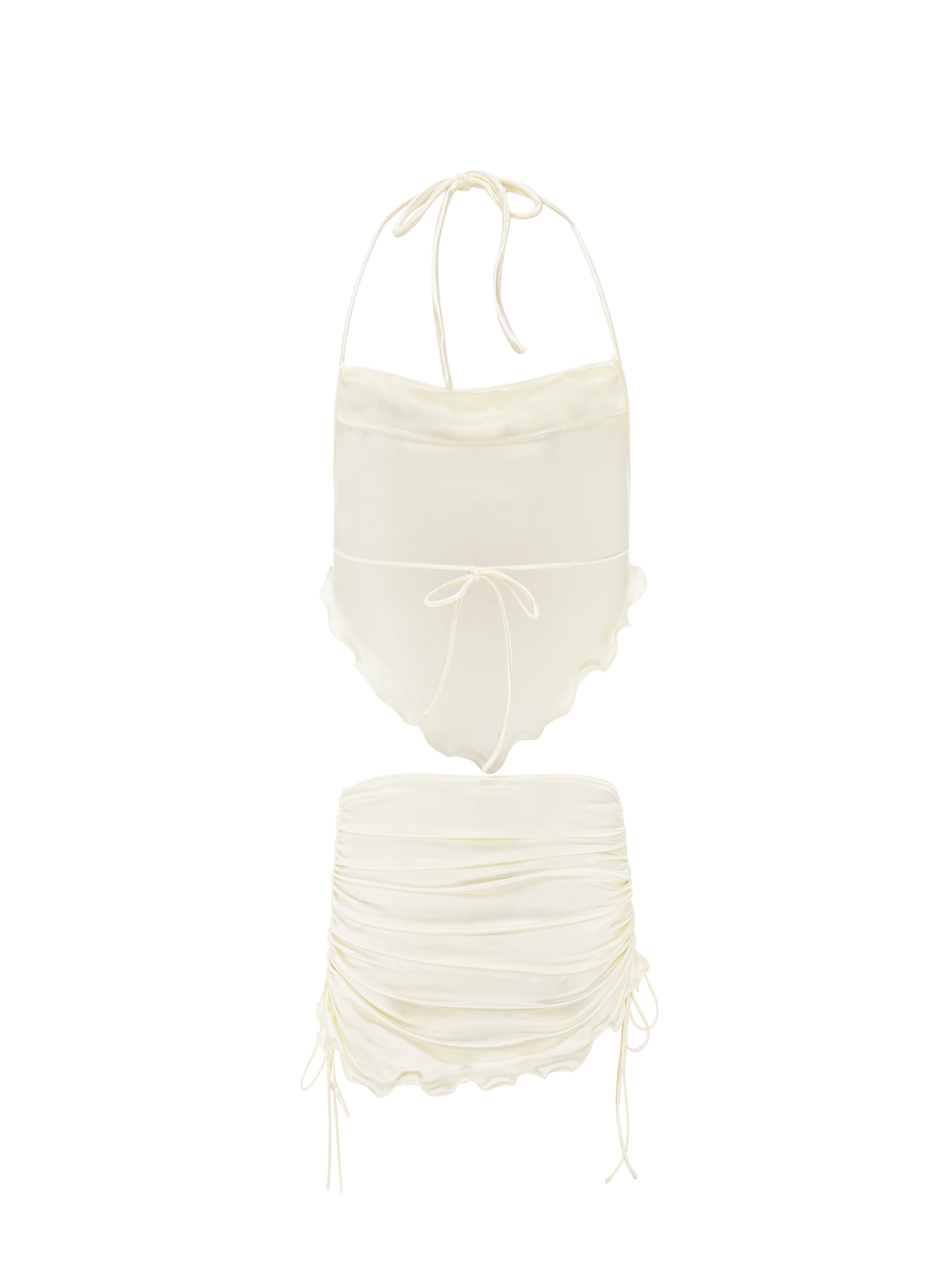 Our Alessia Set comes with a top featuring self-ties turning into a completely open back design that hugs your silhouette and details a delicate, hand-finished hemline with a gently frayed edge. Its matching mini-skirt follows a ruched design with ties on the side hugging your silhouette while making the design adjustable to your own style. It details a delicate, hand-finished hemline with a gently frayed edge.