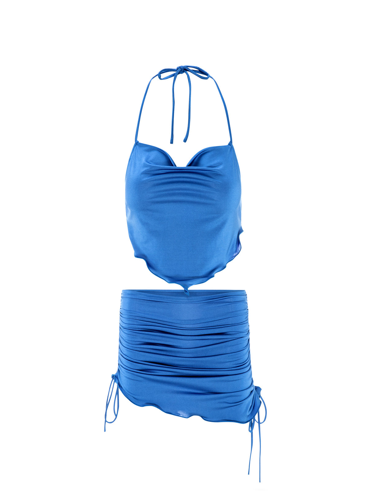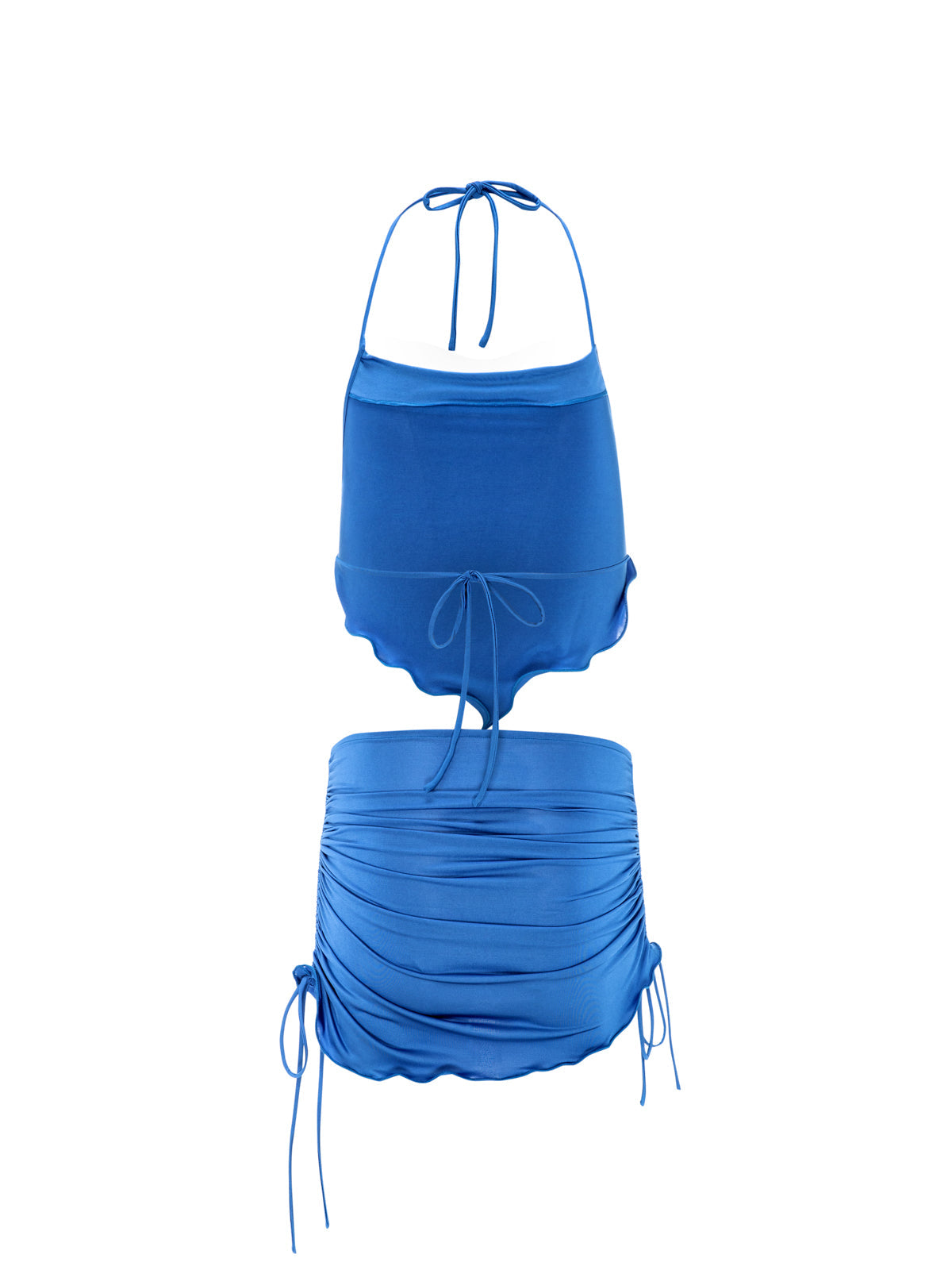 Our Alessia Set comes with a top featuring self-ties turning into a completely open back design that hugs your silhouette and details a delicate, hand-finished hemline with a gently frayed edge. Its matching mini-skirt follows a ruched design with ties on the side hugging your silhouette while making the design adjustable to your own style. It details a delicate, hand-finished hemline with a gently frayed edge.
