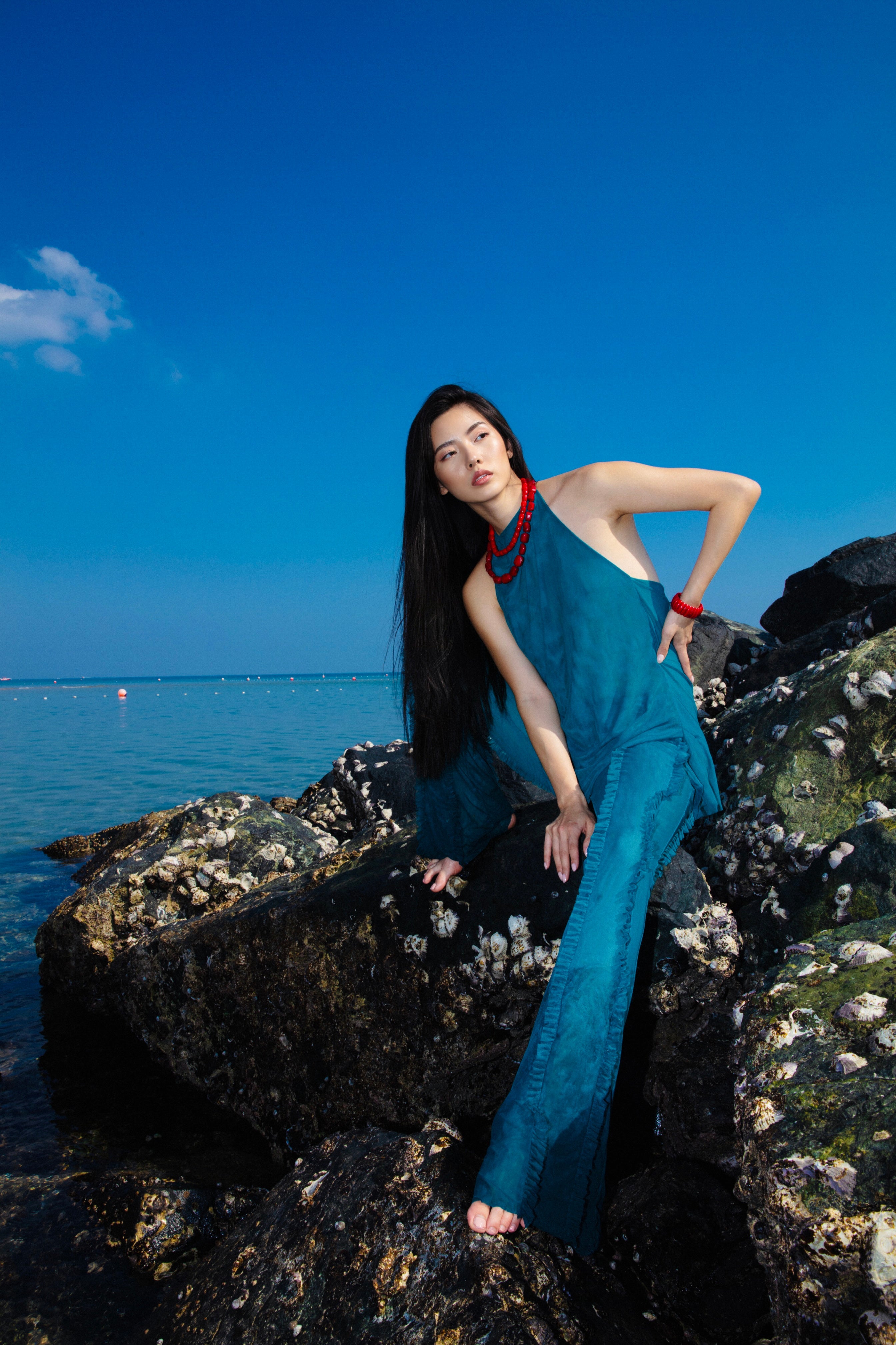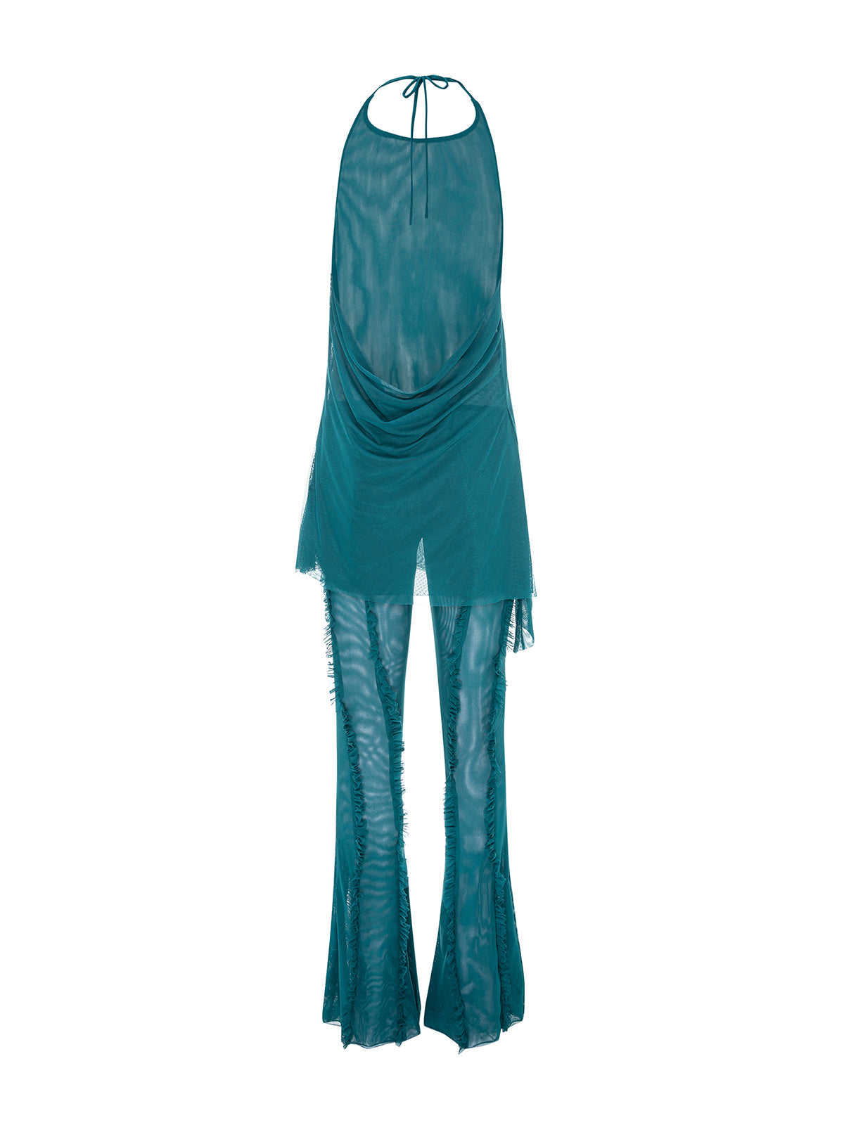 The Angelica Top is an asymmetrical long top with a high neck that ties at the back, revealing an open scooped back, all crafted from semi-sheer fabric. Pair them with the Angelica Pants for a coordinated look from head to toe.