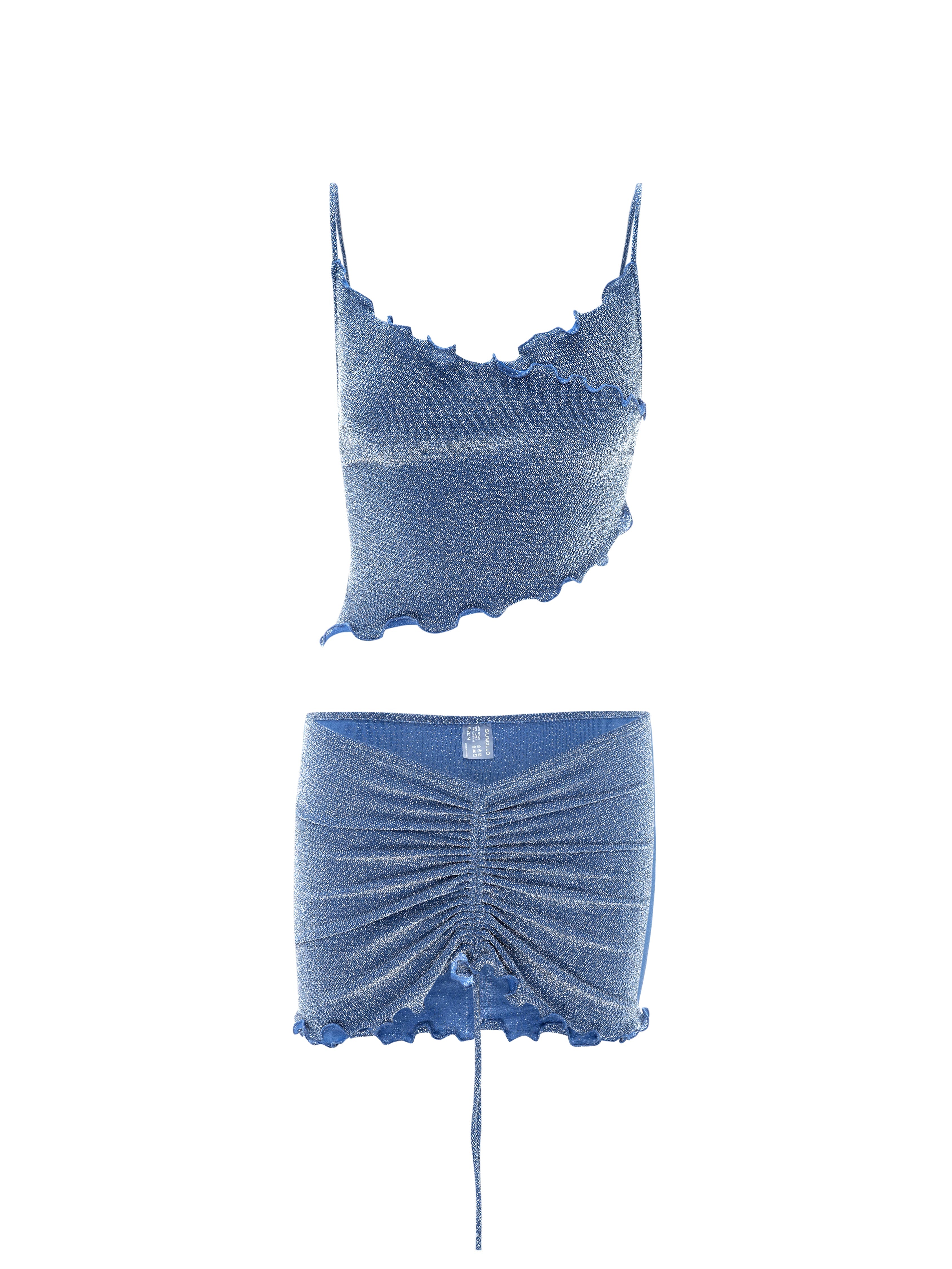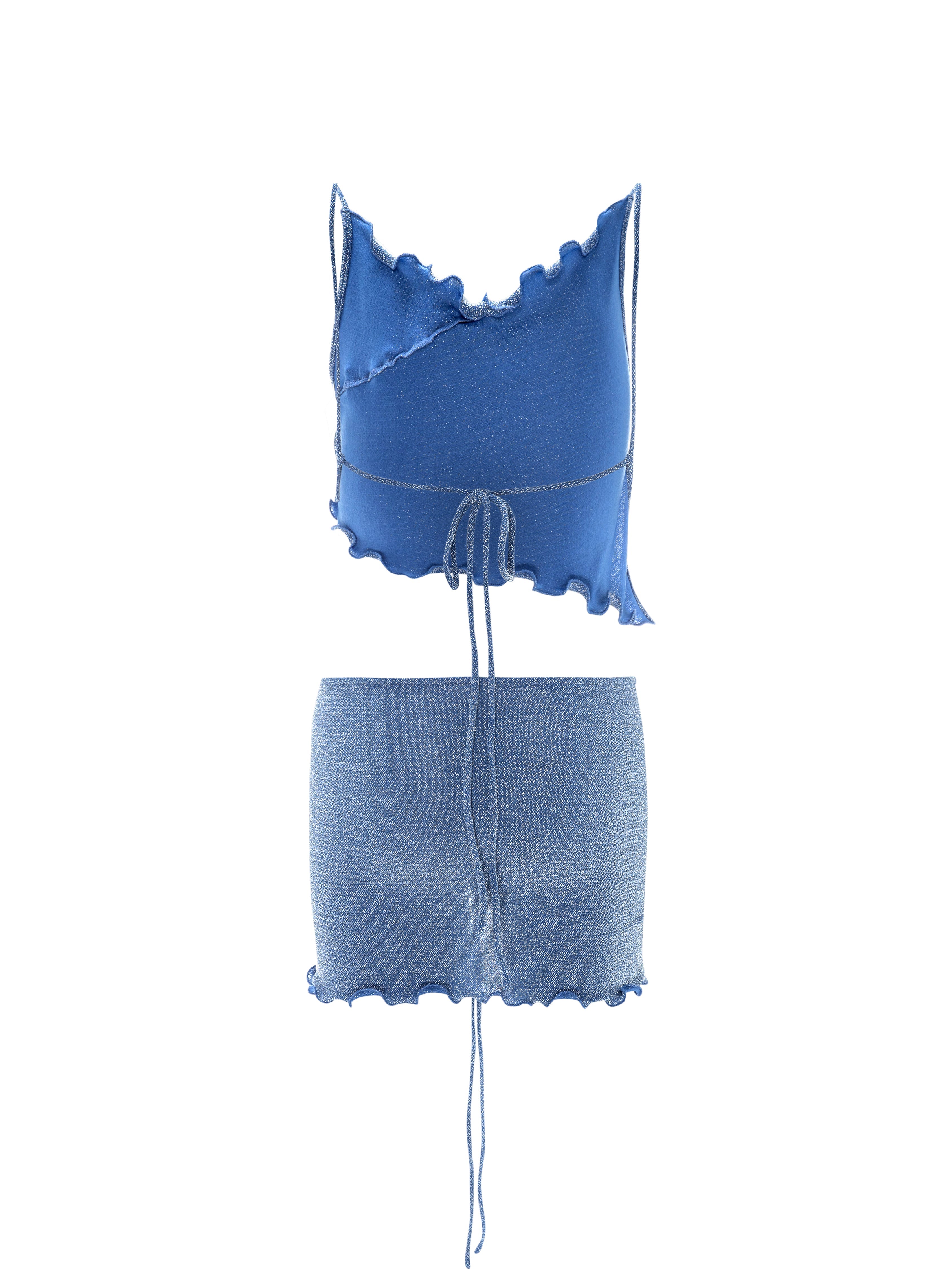 The Anna Sparkly Set features a top with self-tie straps, creating a fully open back that accentuates your silhouette. Adorned with a delicate, hand-finished hemline and a gently frayed edge, it exudes elegance. The matching mini-skirt boasts a ruched design with center ties, embracing your figure, and is elegantly finished with a delicate, gently frayed hemline.