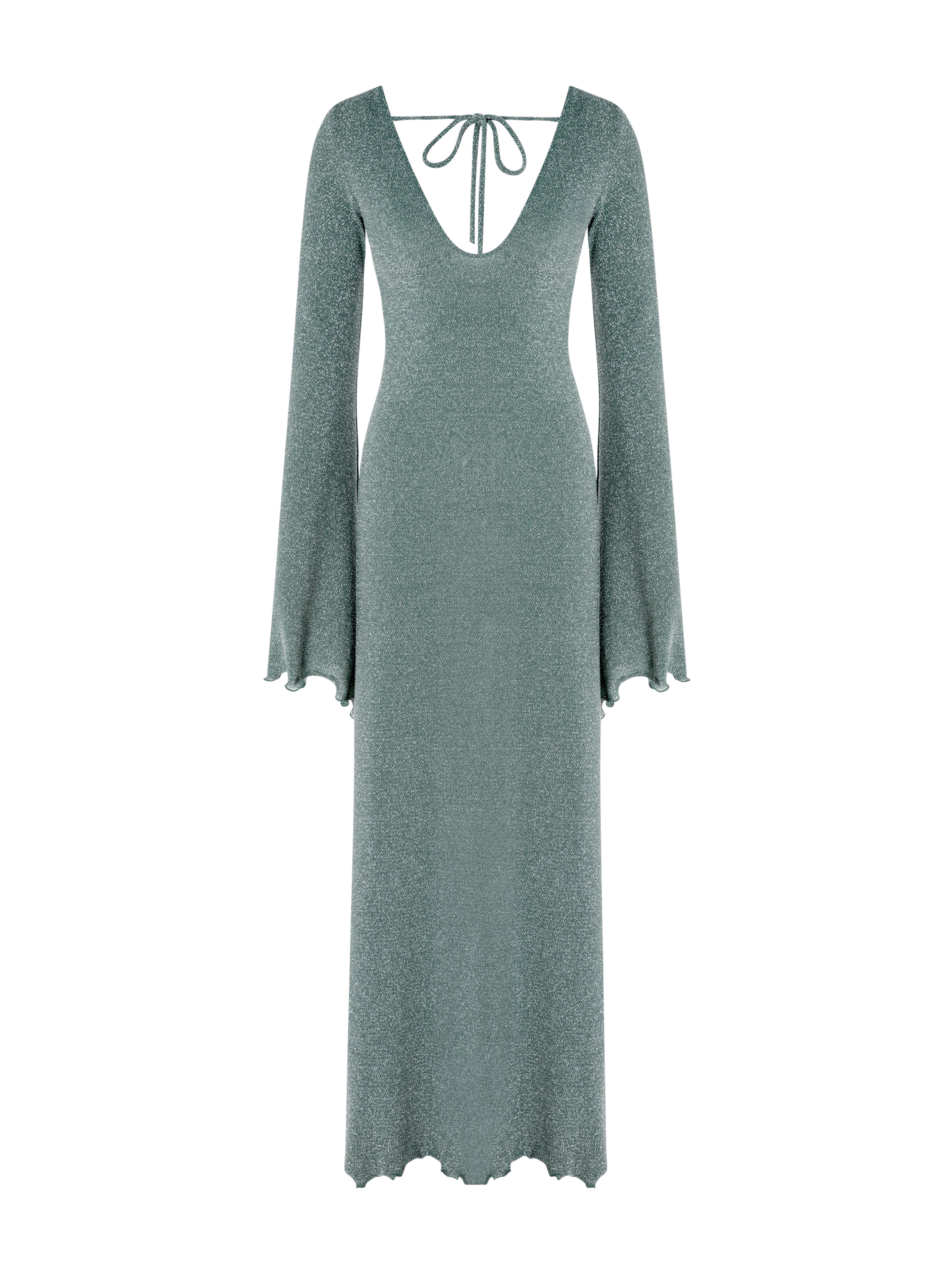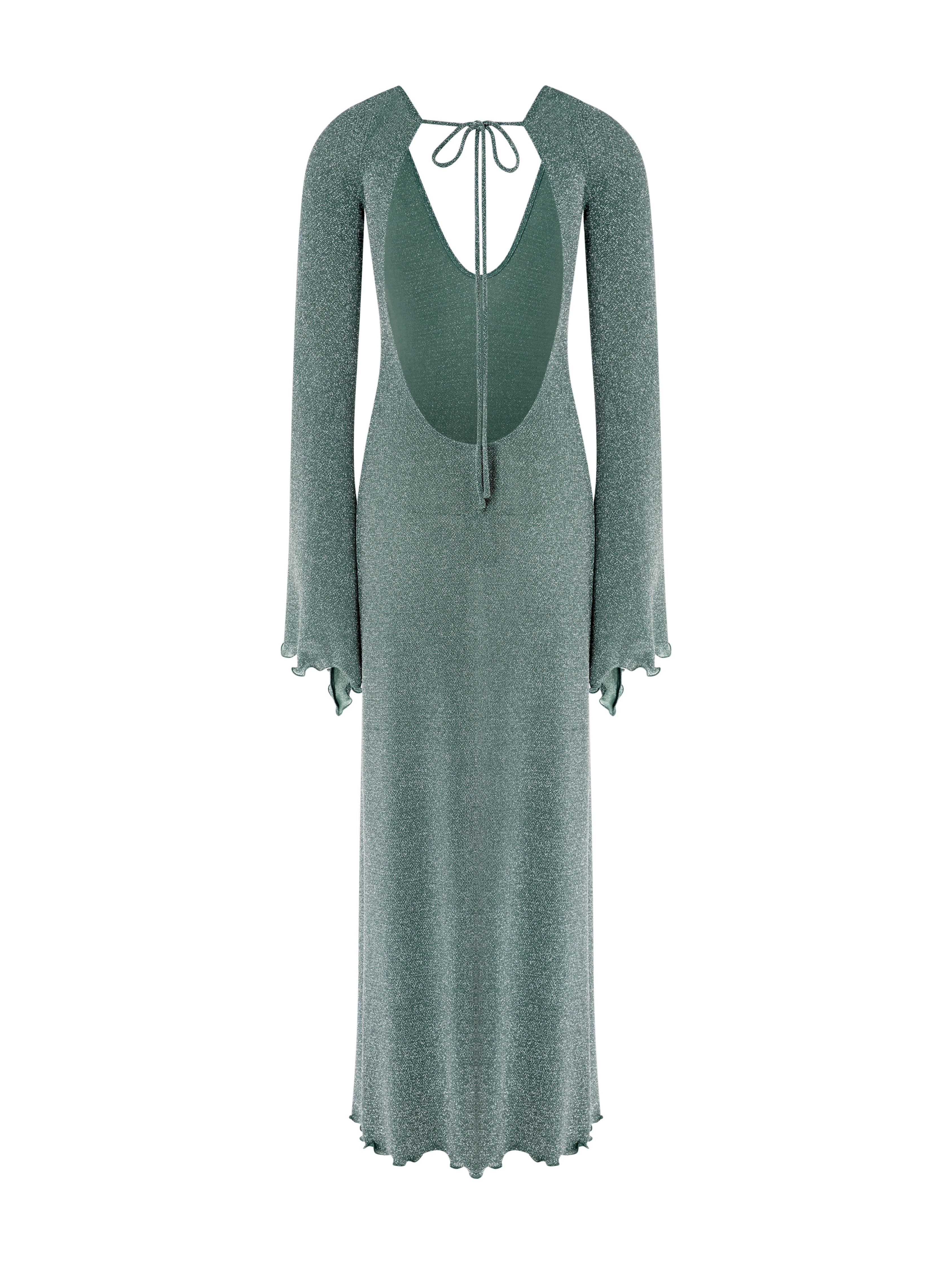 Color Sage Material 65% nylon, 30% lurex, 5% elastane Dress Length Maxi Closure Type Back tie Sleeves Long, wide sleeves Care Instructions Hand wash or dry clean